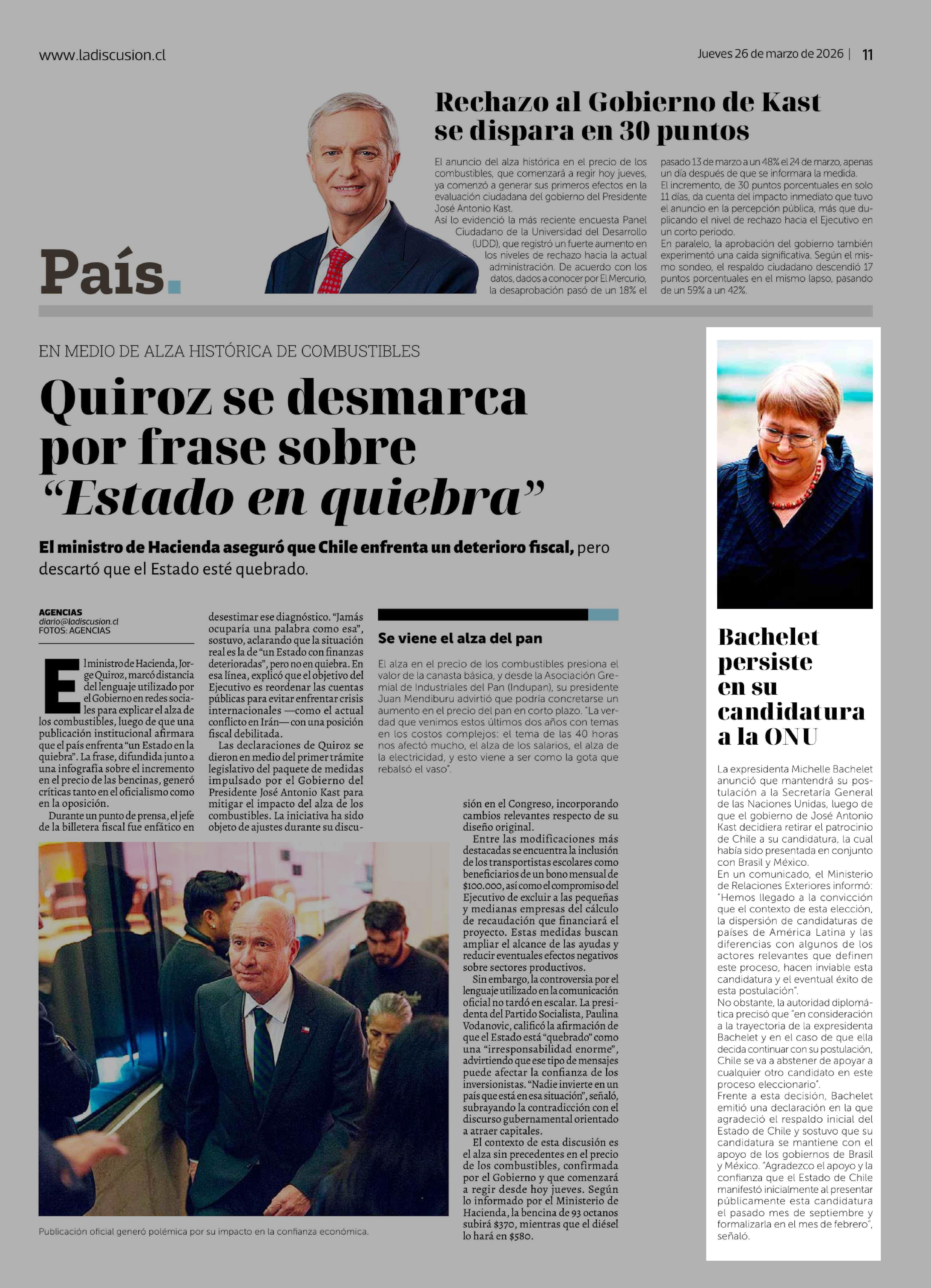 Bachelet persiste en su candidatura a la ONU 26-03-2026 La Discusión |