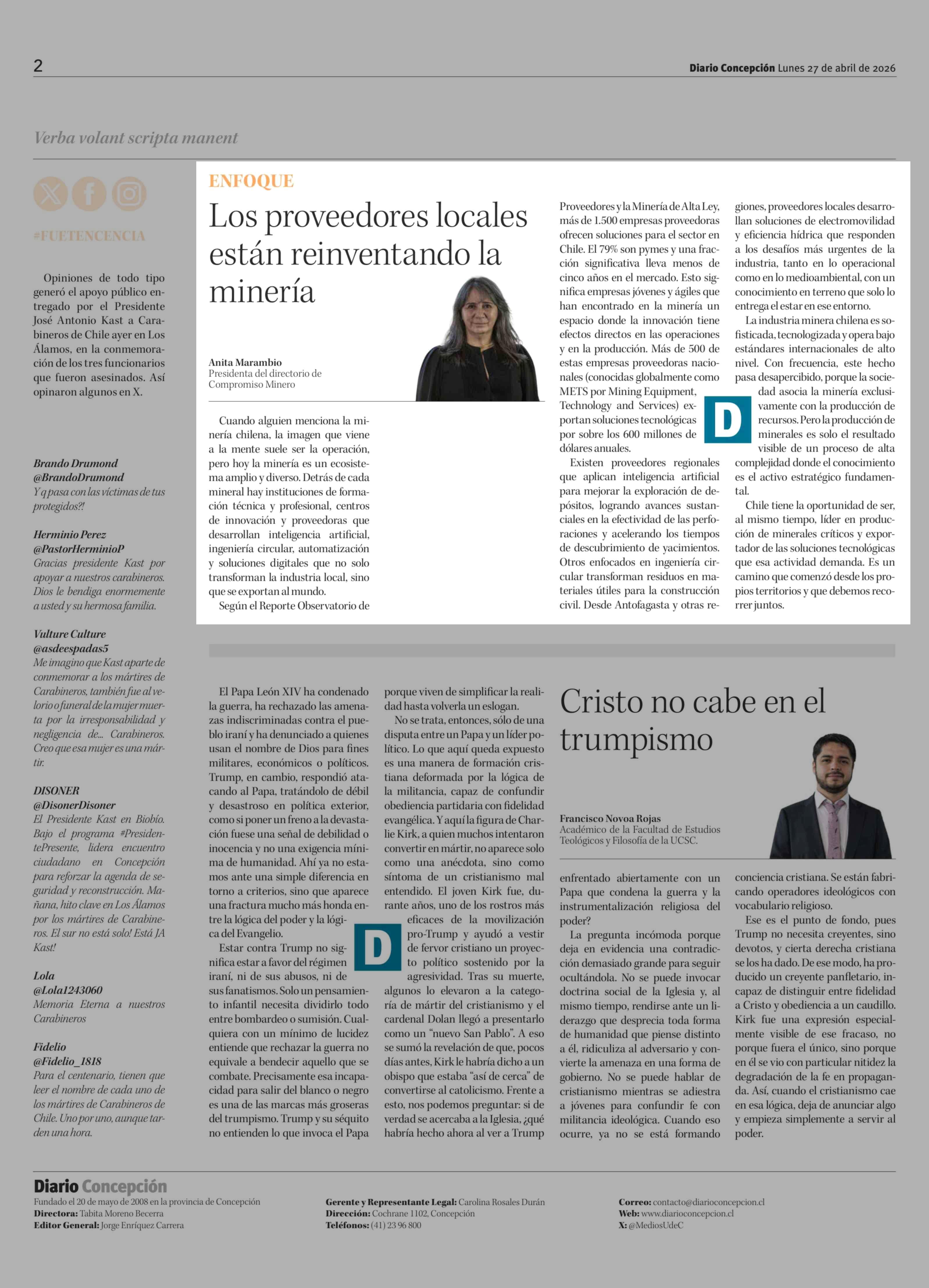 Columnas de Opinión: Los proveedores locales están reinventando la minería 27-04-2026 Diario Concepción |