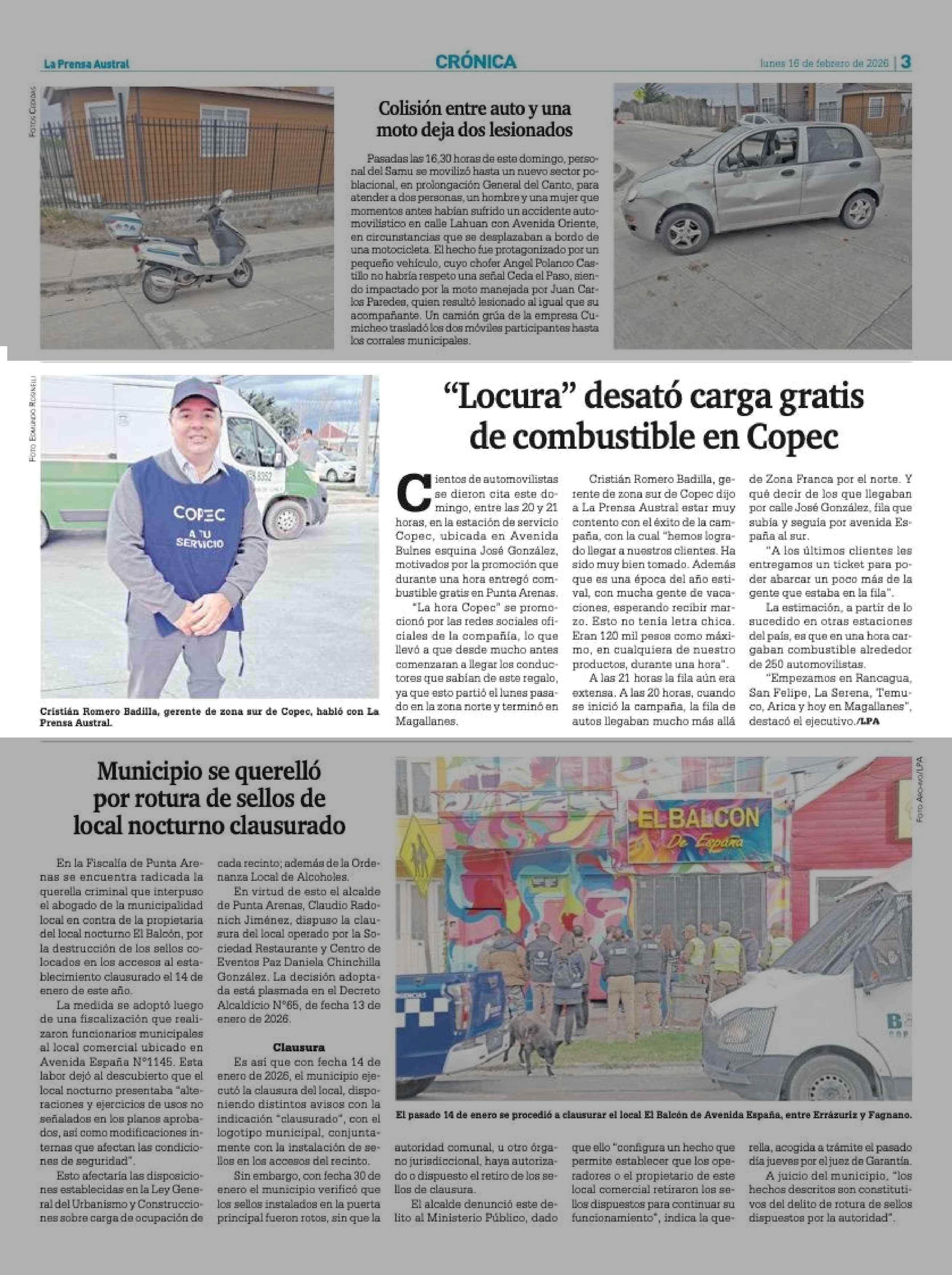 "Locura" desató carga gratis de combustible en Copec 16-02-2026 La Prensa Austral |