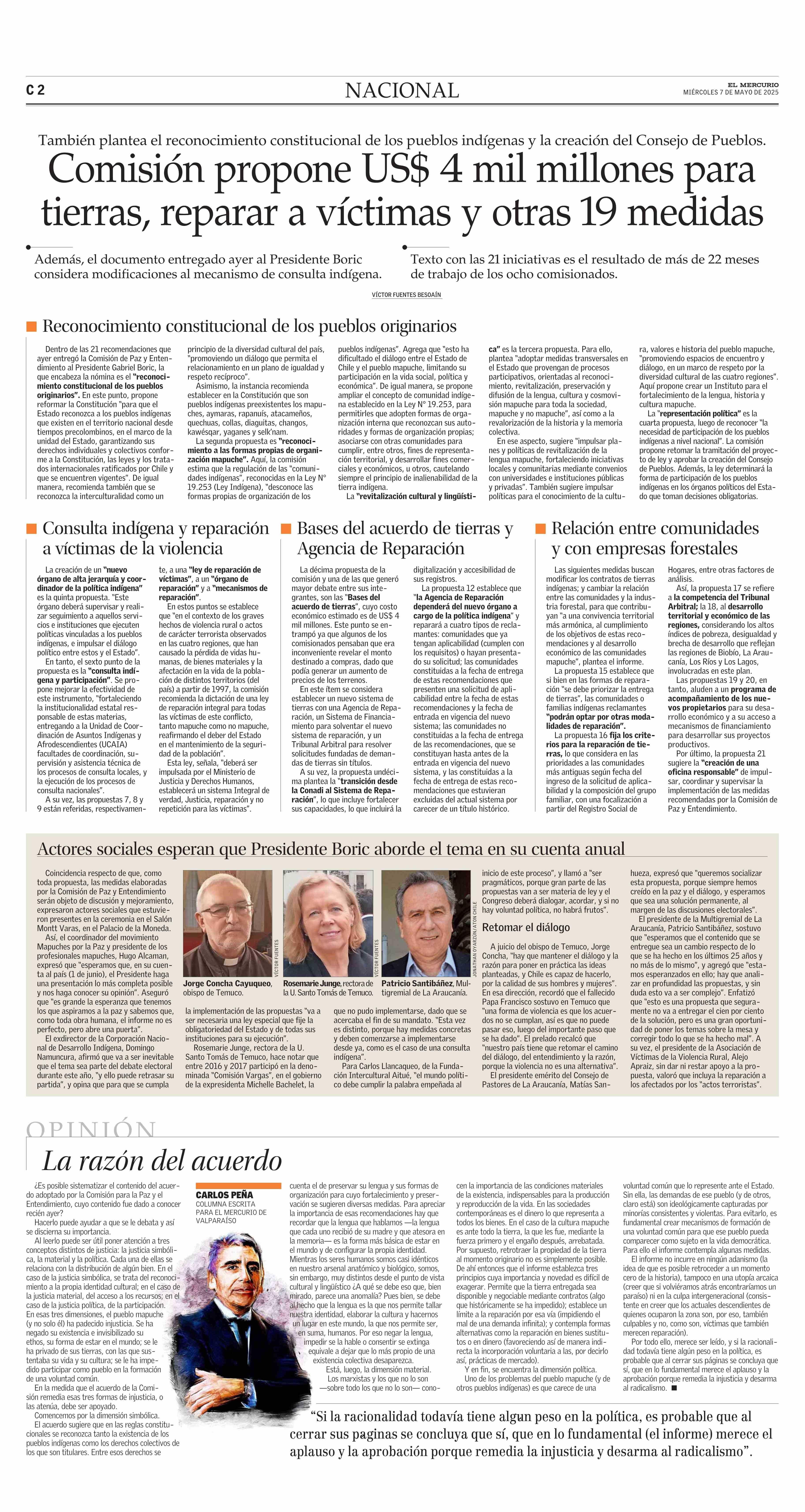 Comisión propone US$ 4 mil millones para tierras, reparar a víctimas y otras 19 medidas 07-05-2025 El Mercurio |