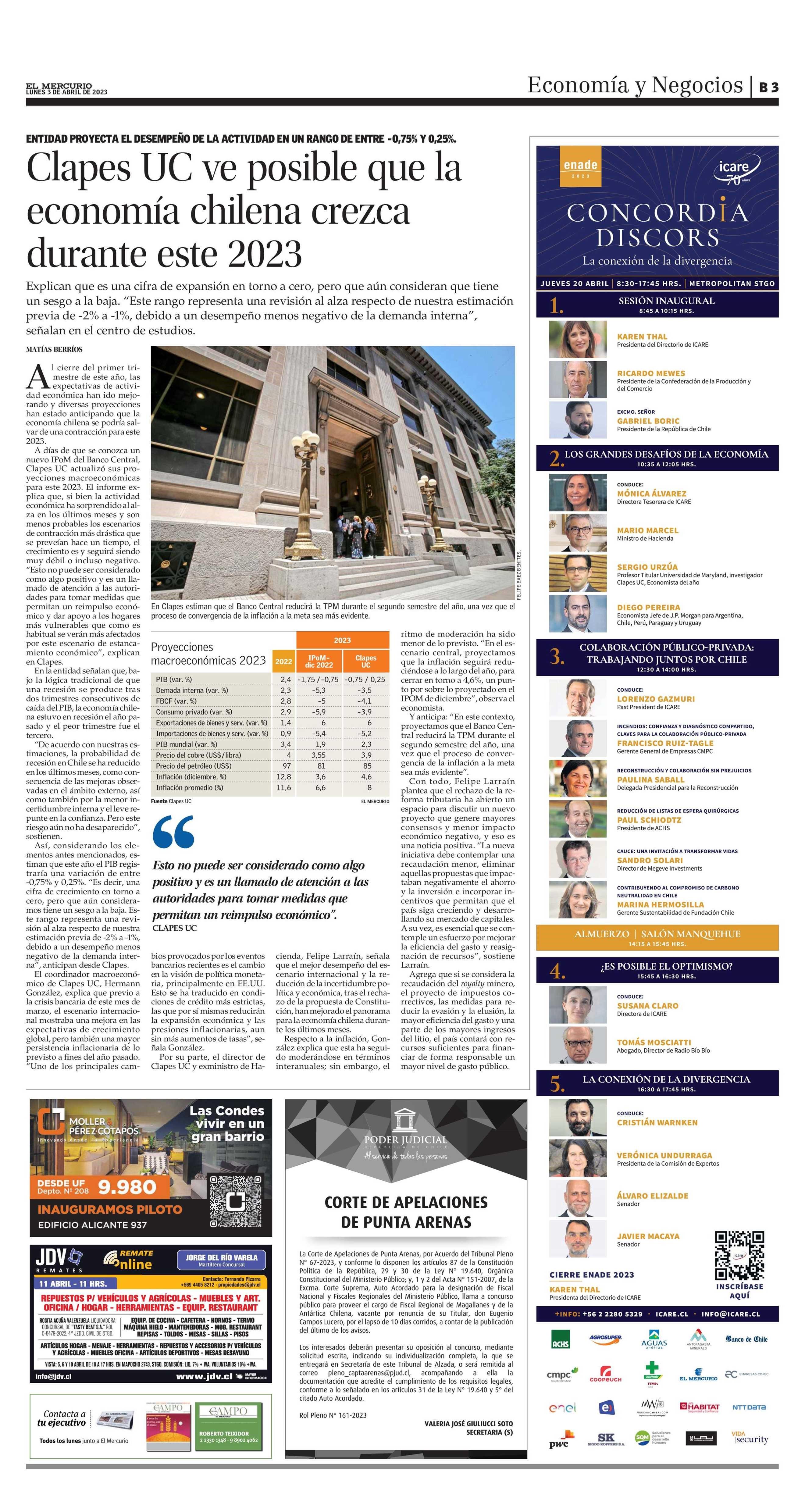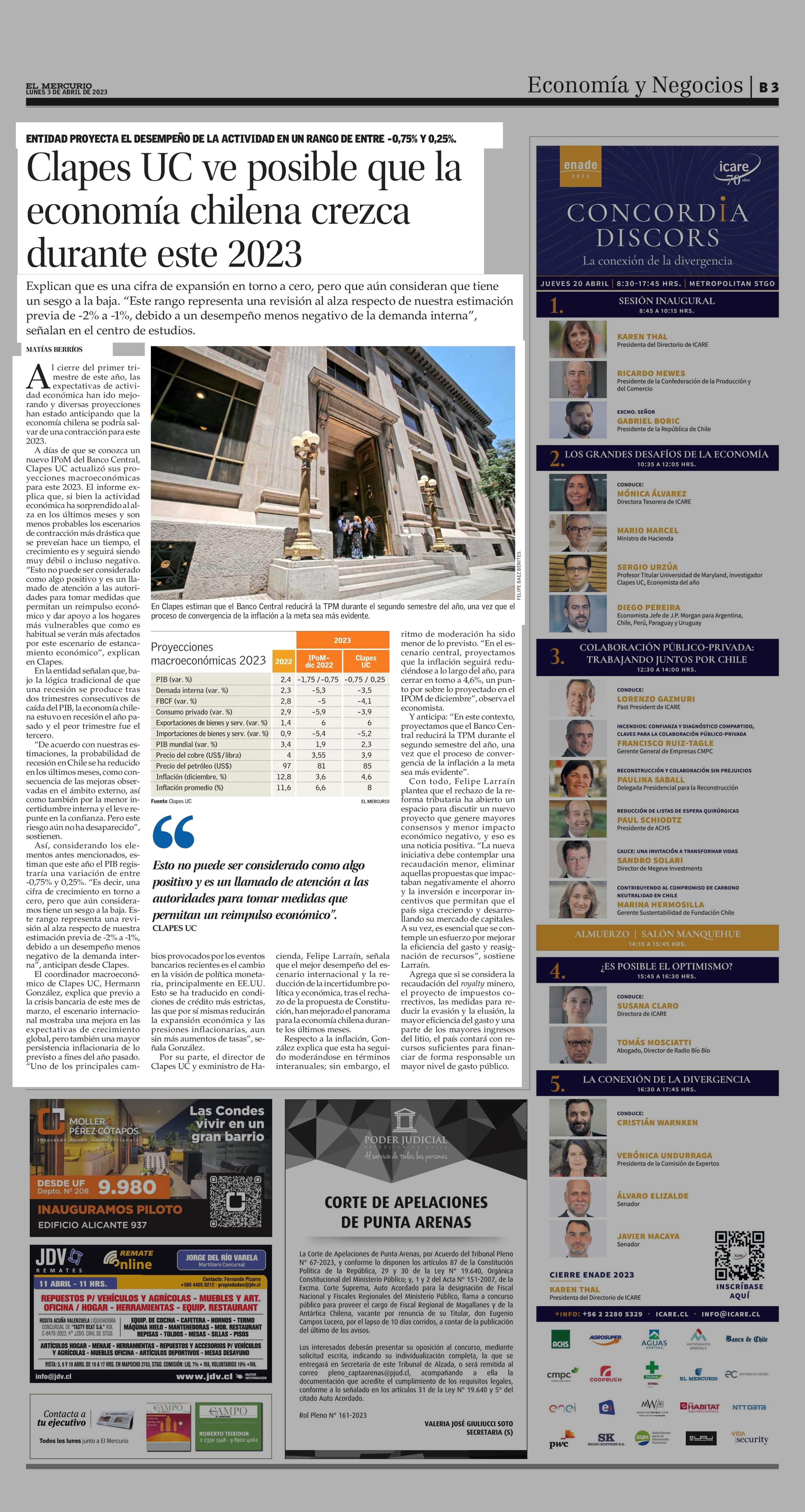 Clapes UC ve posible que la economía chilena crezca durante este 2023 03-04-2023 El Mercurio |
