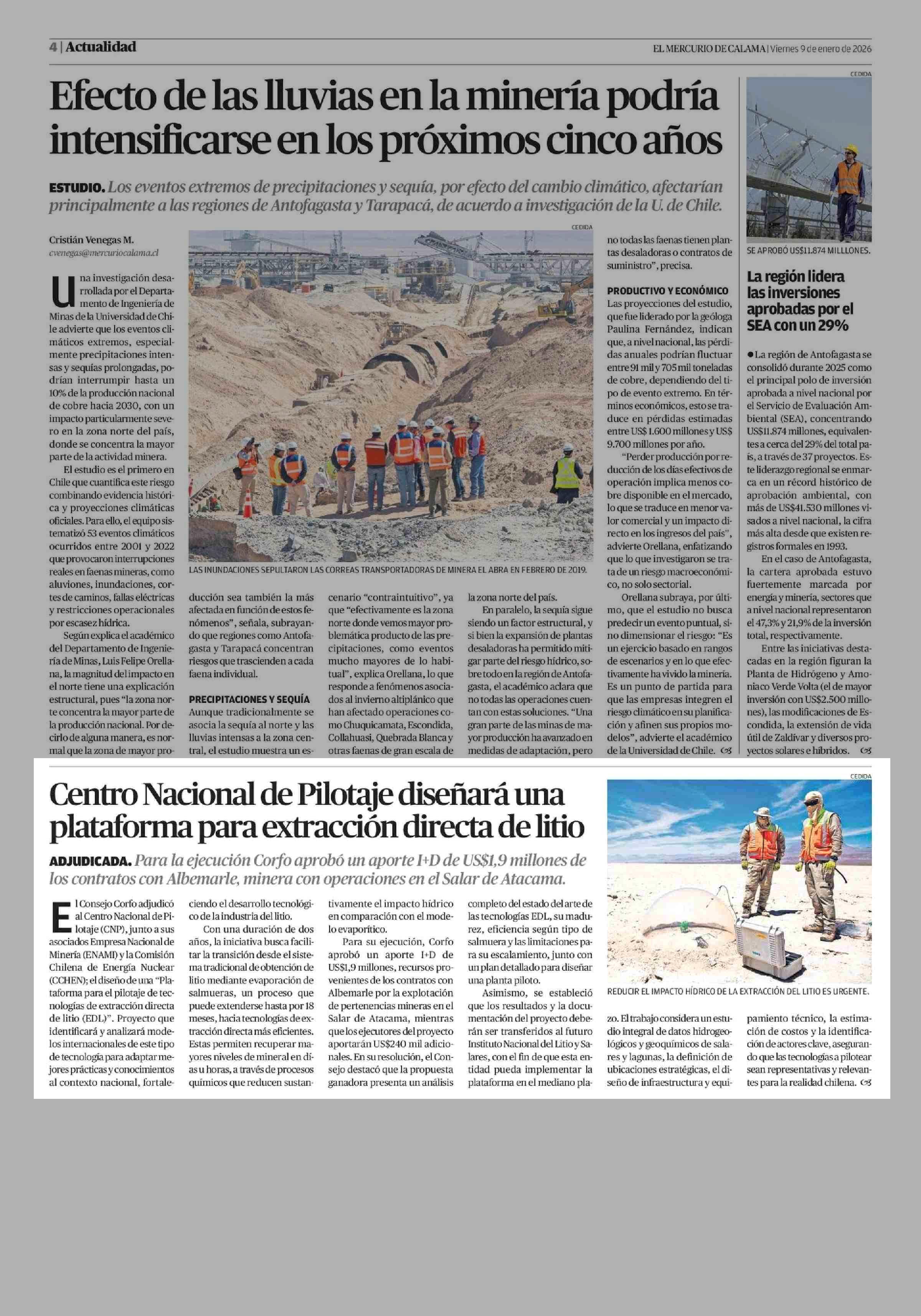 Centro Nacional de Pilotaje diseñará una plataforma para extracción directa de litio 09-01-2026 El Mercurio de Calama |
