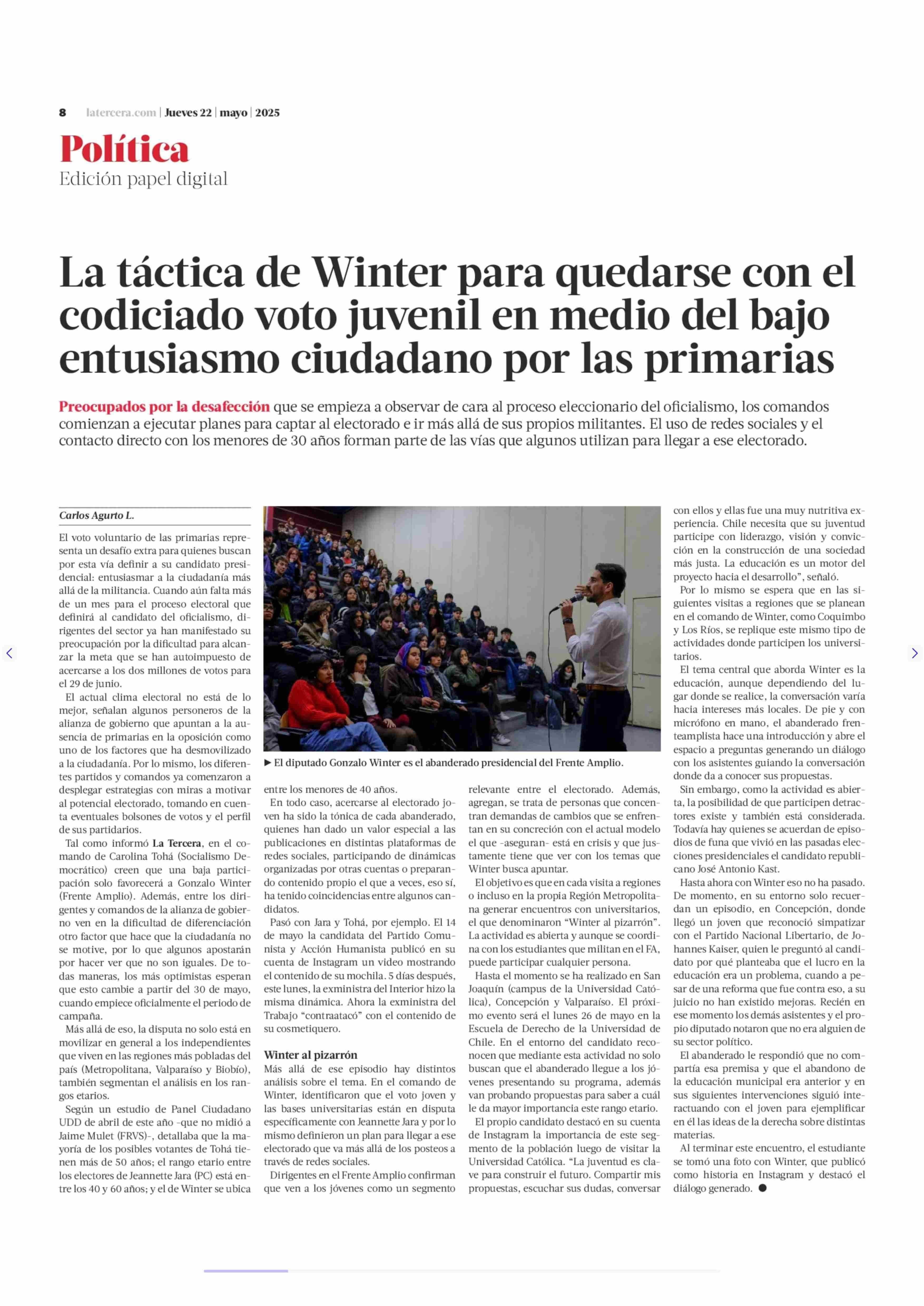 La táctica de Winter para quedarse con el codiciado voto juvenil en medio del bajo entusiasmo ciudadano por las primarias 22-05-2025 La Tercera |