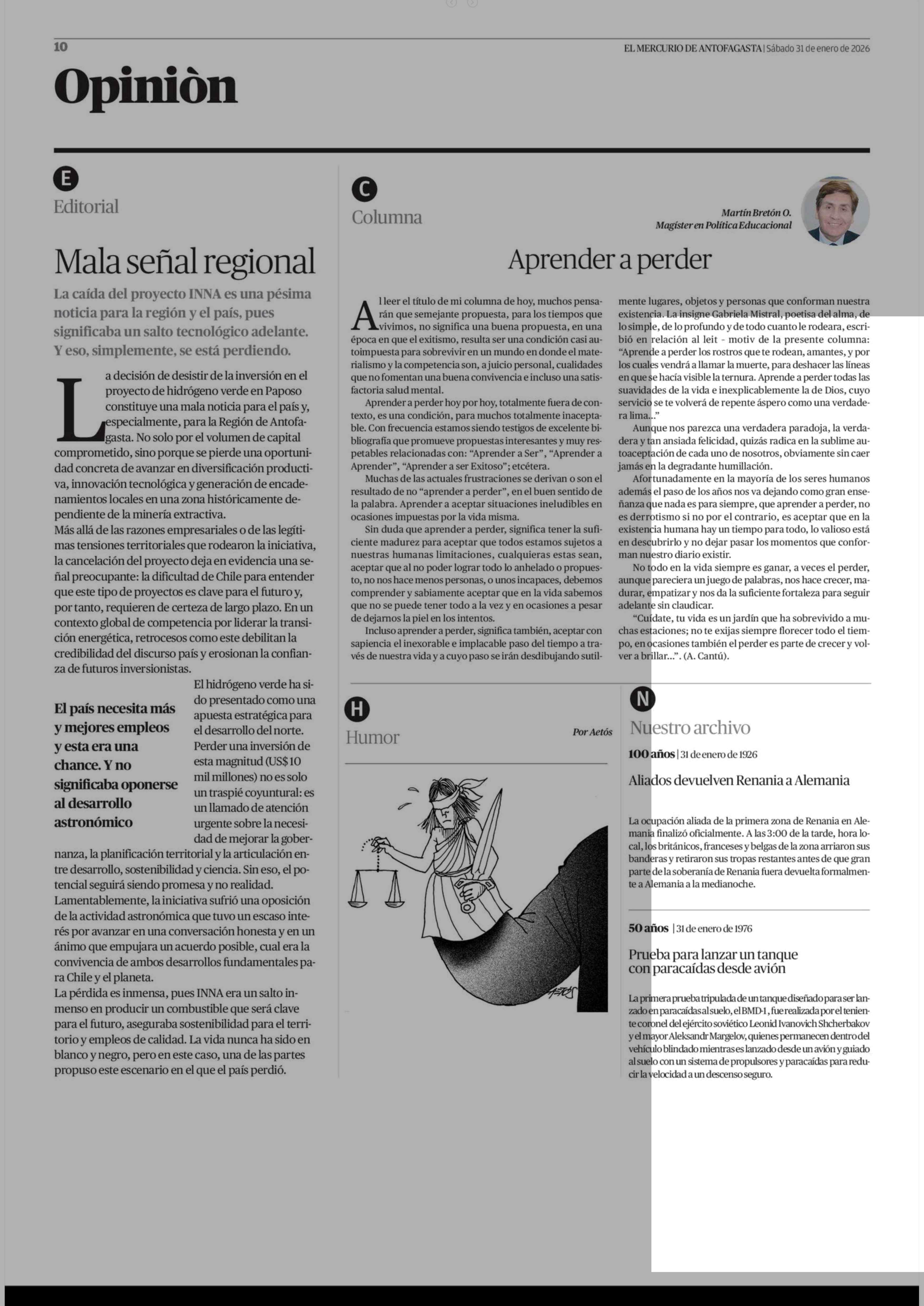 Columnas de Opinión: Aprender a perder 31-01-2026 El Mercurio de Antofagasta |