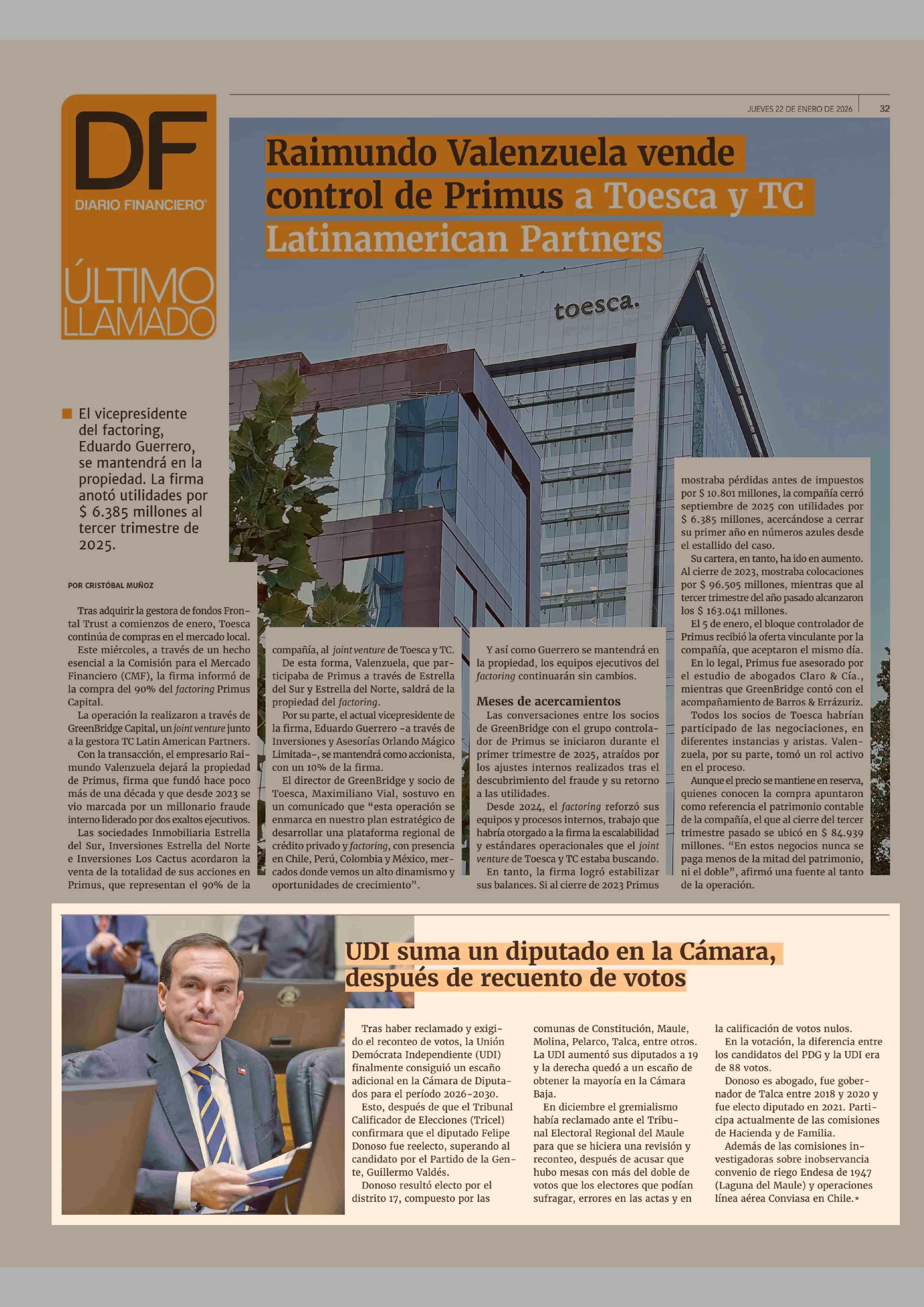 UDI suma un diputado en la Cámara, después de recuento de votos 22-01-2026 Diario Financiero |