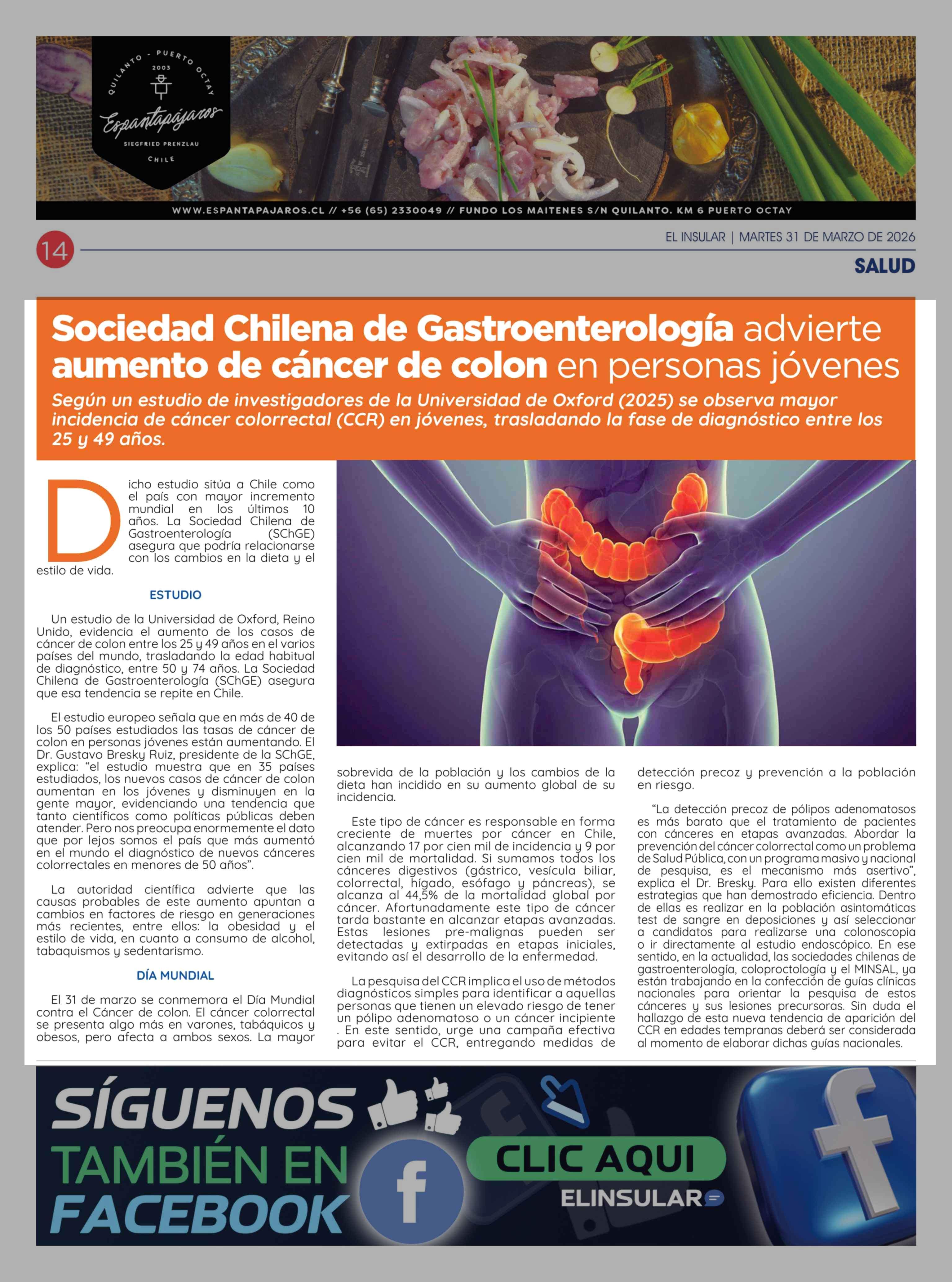 Sociedad Chilena de Gastroenterología advierte aumento de cáncer de colon en personas jóvenes 31-03-2026 El Insular |