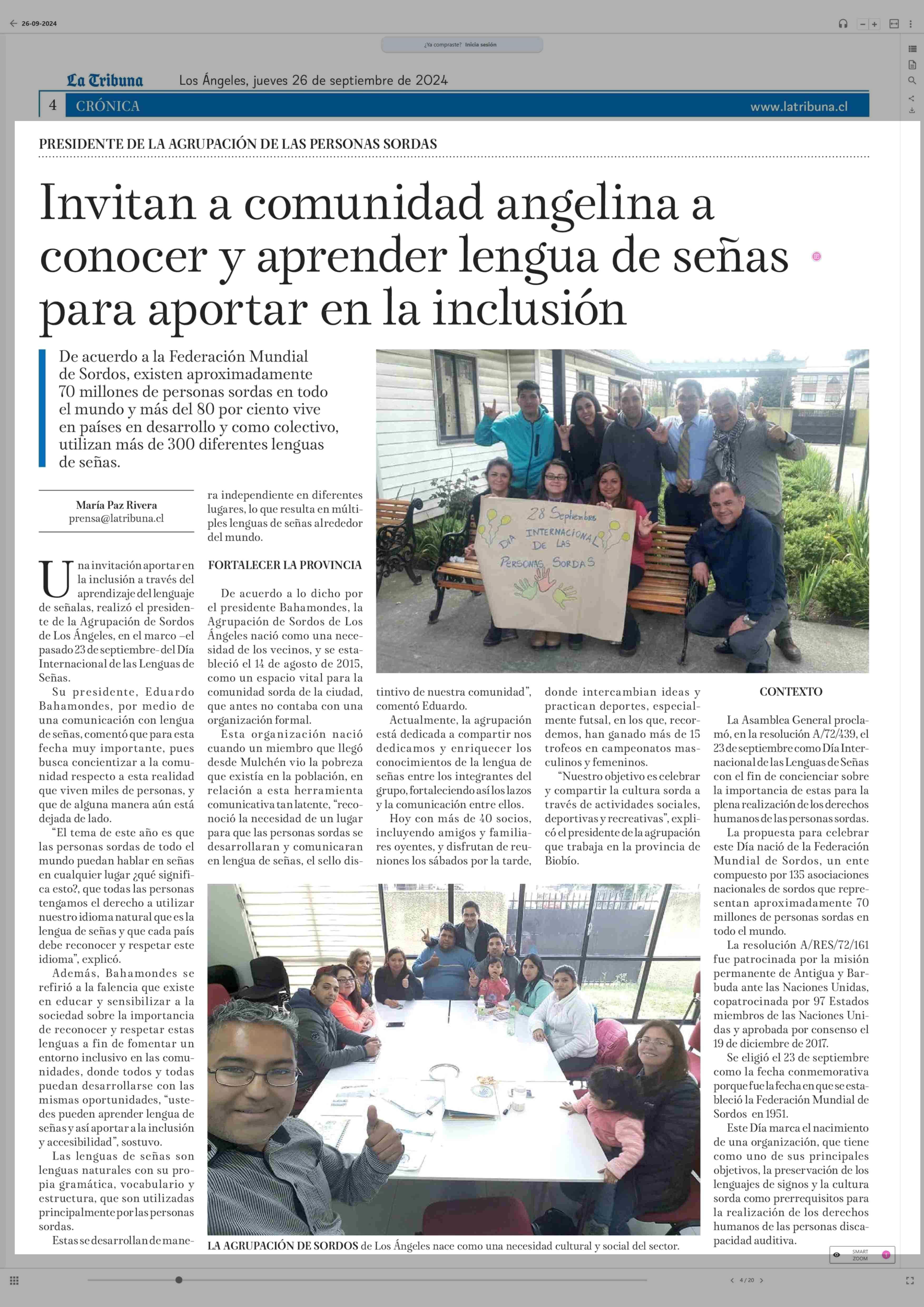 Invitan a comunidad angelina a conocer y aprender lengua de señas : para aportar en la inclusión 26-09-2024 La Tribuna |