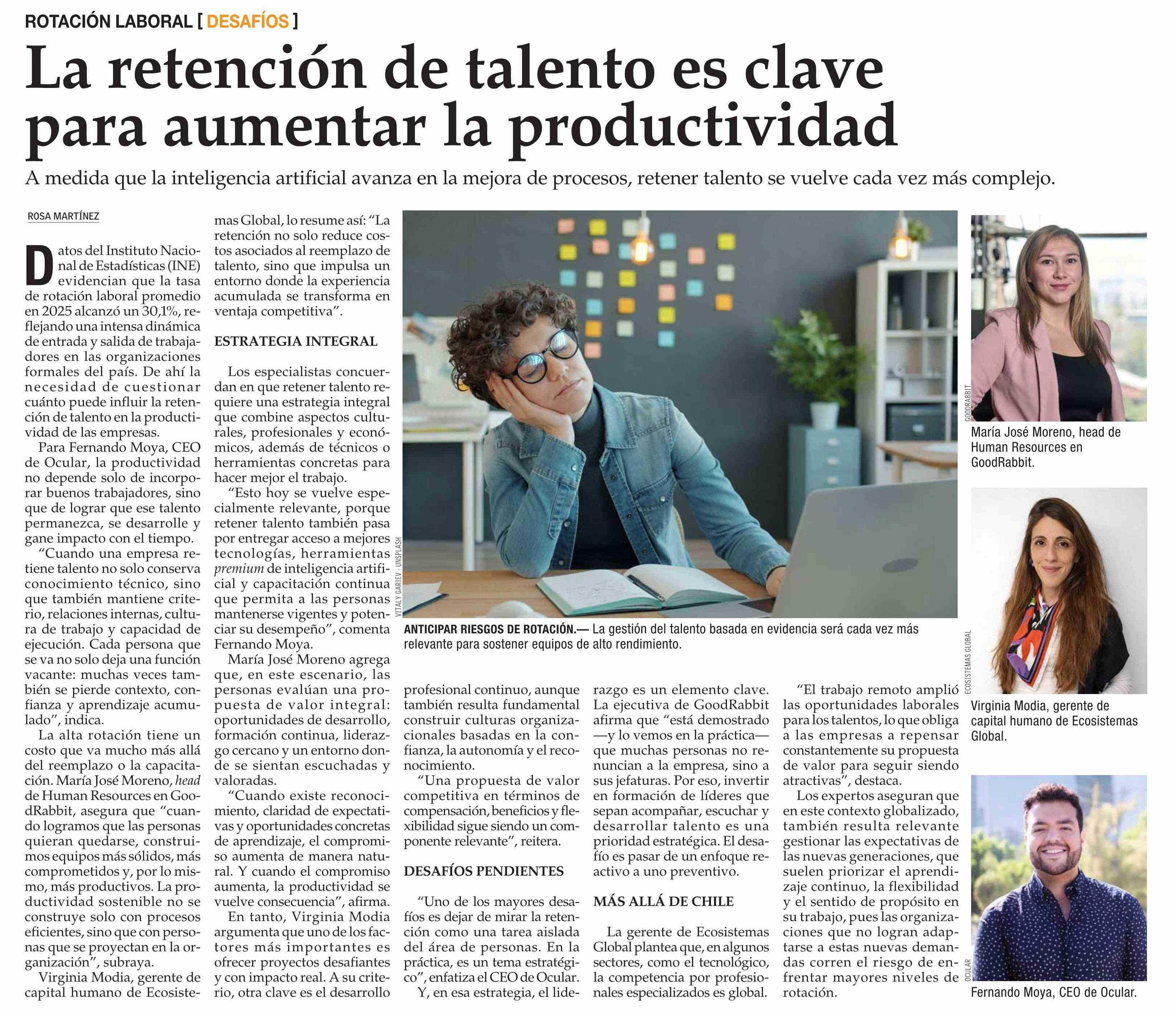 La retención de talento es clave para aumentar la productividad 15-03-2026 El Mercurio |
