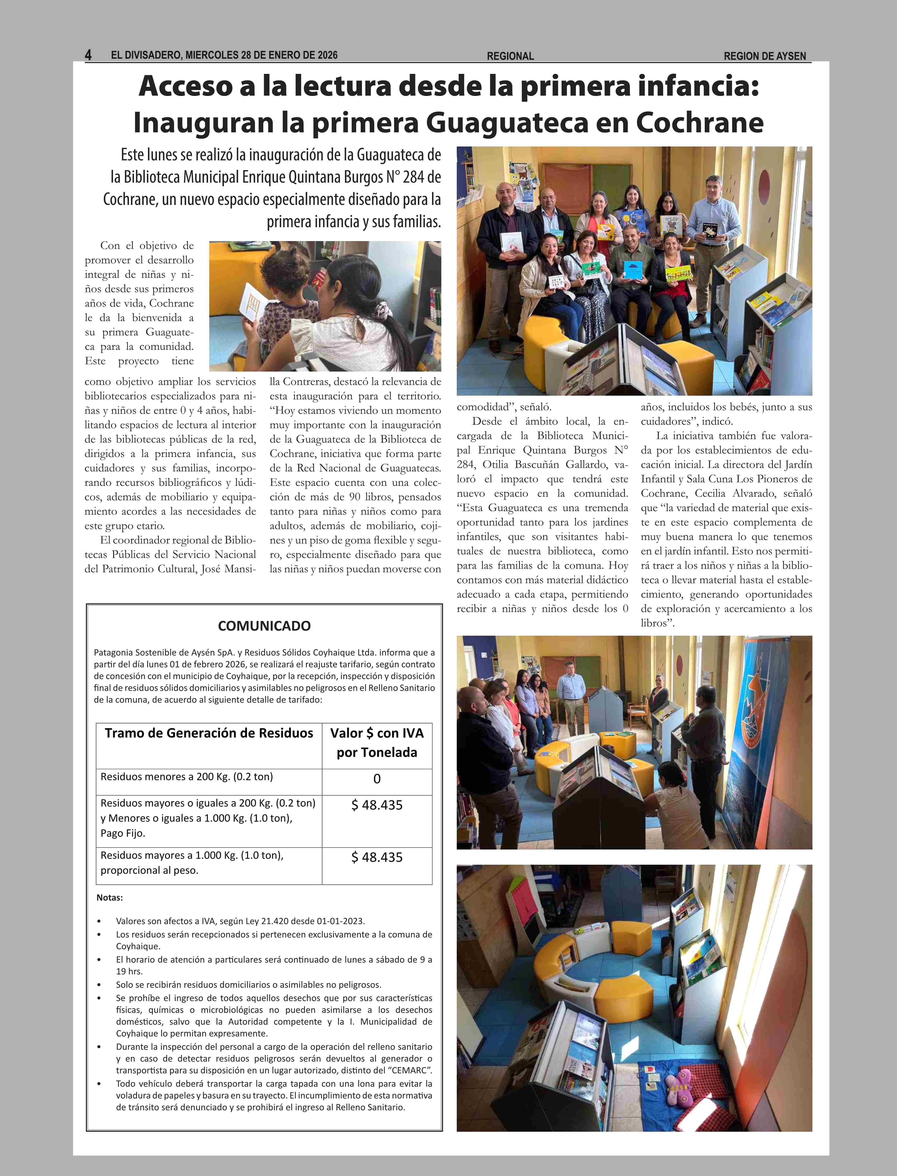 Acceso a la lectura desde la primera infancia: Inauguran la primera Guaguateca en Cochrane 28-01-2026 El Divisadero |