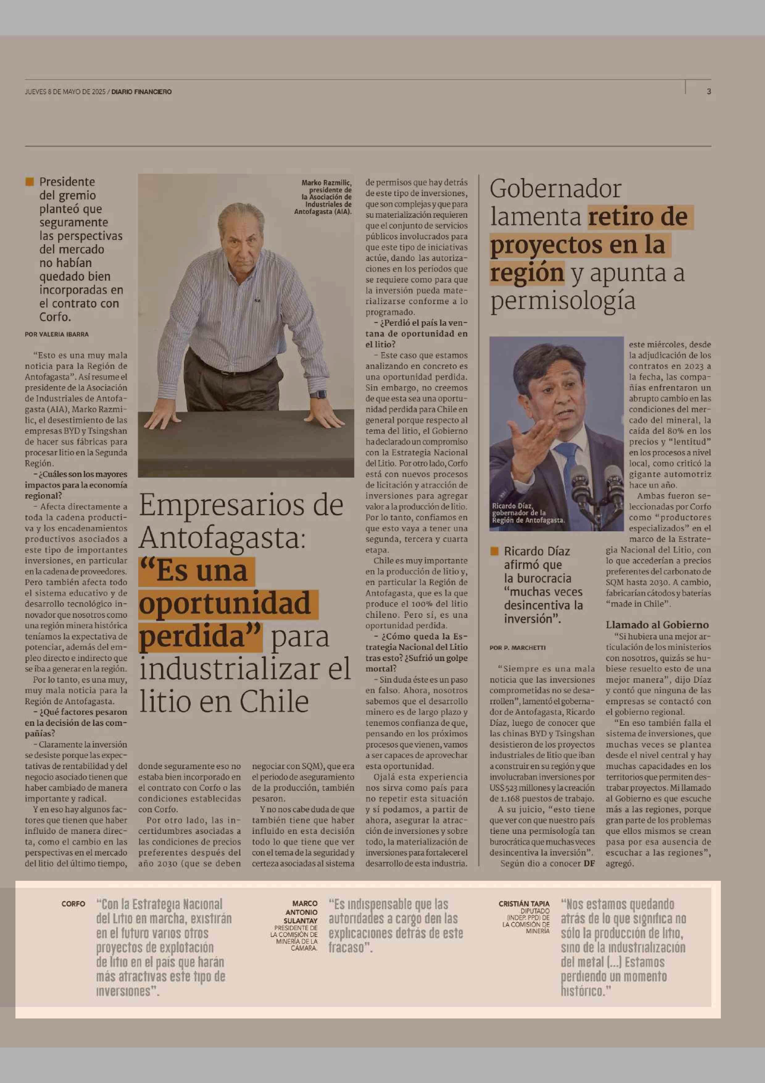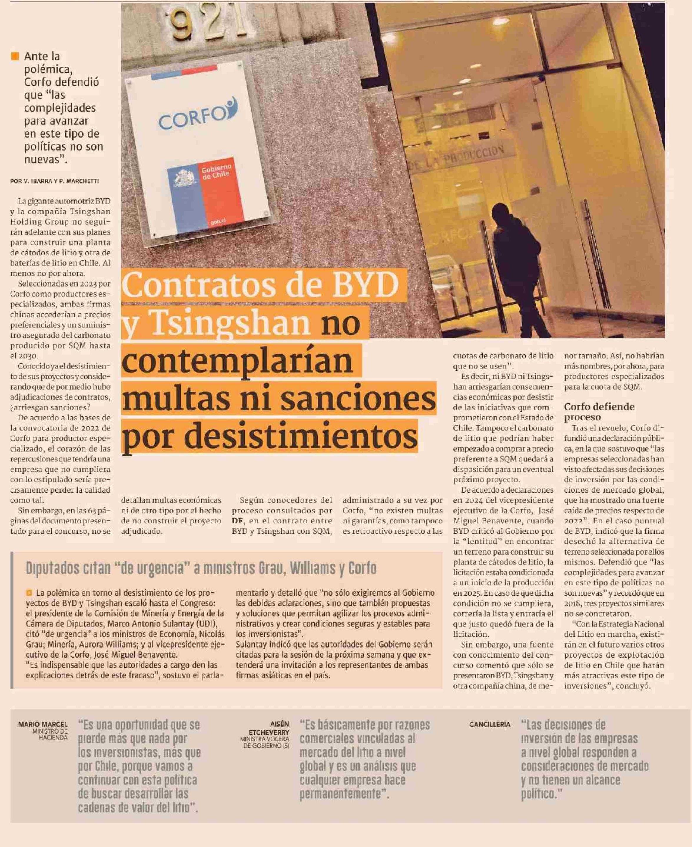 Contratos de BYD y Tsingshan no contemplarian multas ni sanciones por desistimientos 08-05-2025 Diario Financiero |