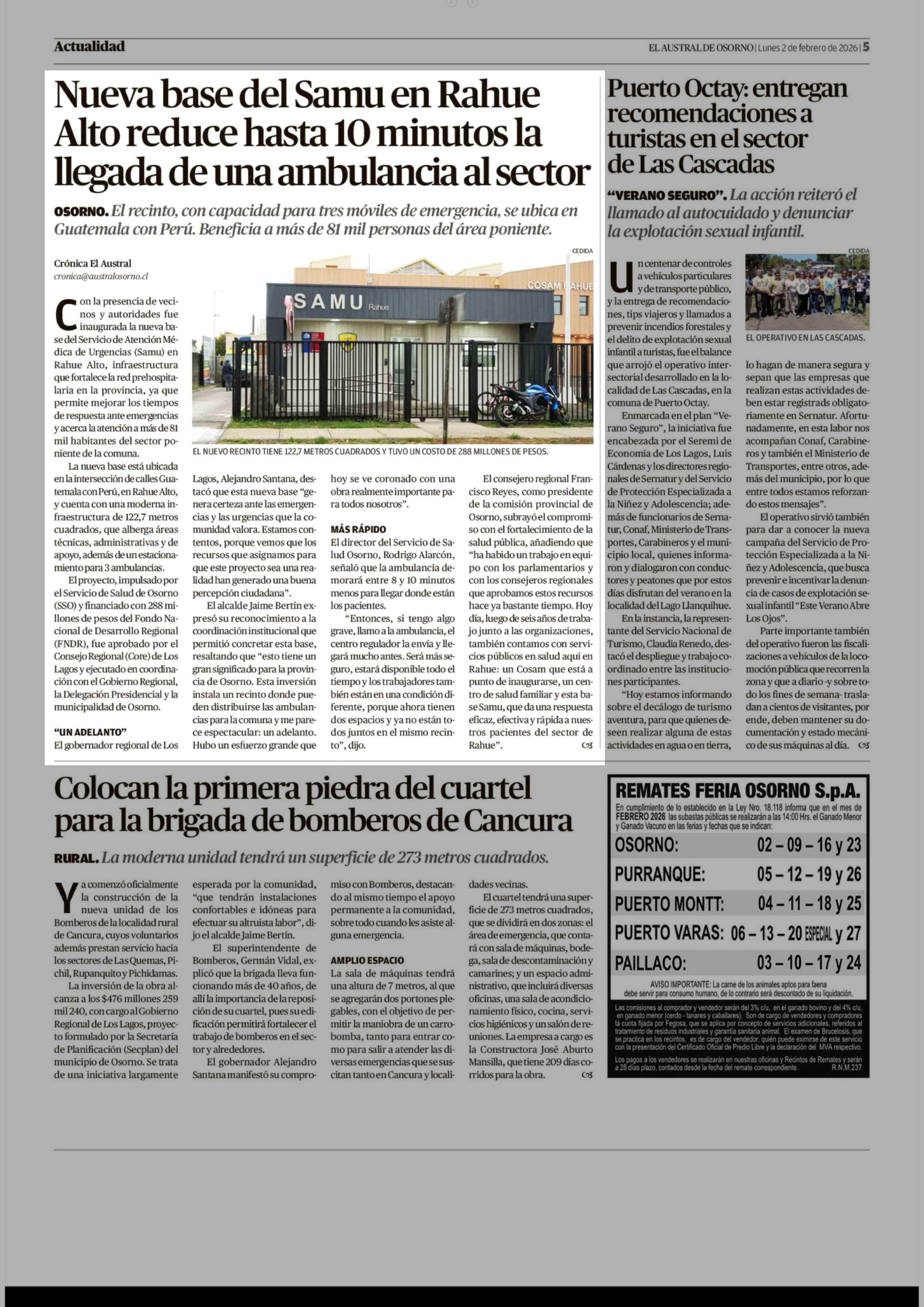 Nueva base del Samu en Rahue Alto reduce hasta 10 minutos la llegada de una ambulancia al sector 02-02-2026 El Austral de Osorno |