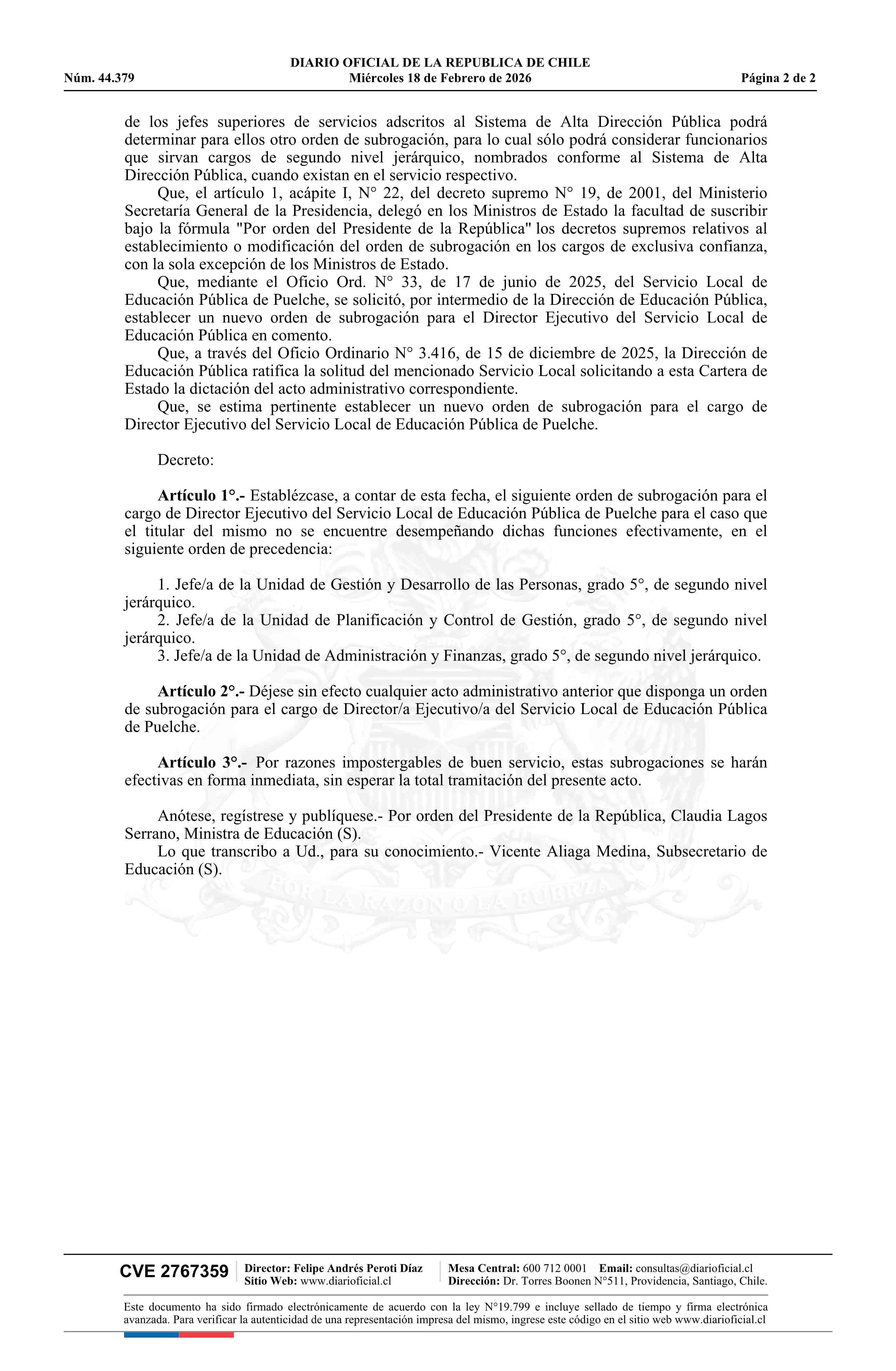 Título: Decreto exento número 75, de 2026.- Establece nuevo orden de subrogación del cargo de Director Ejecutivo del Servicio Local de Educación Pública de Puelche