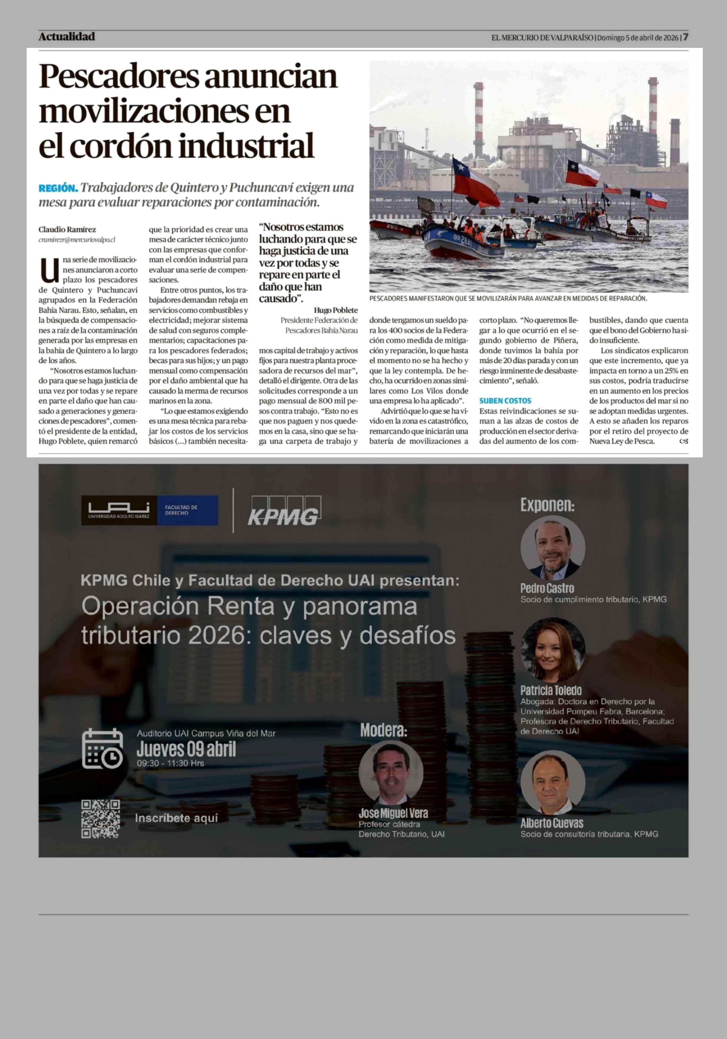 Pescadores anuncian movilizaciones en el cordón industrial 05-04-2026 El Mercurio de Valparaíso |