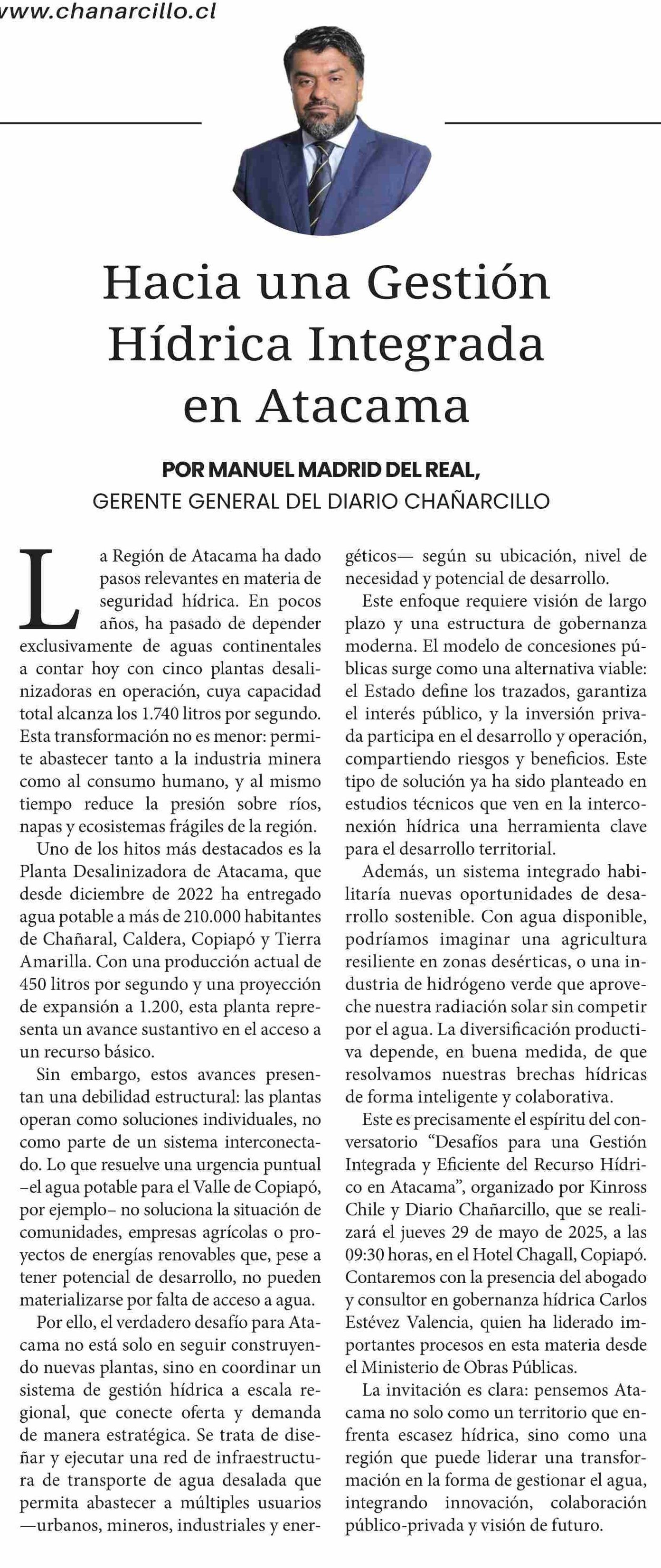 Columnas de Opinión: Hacia una Gestión Hídrica Integrada en Atacama 27-05-2025 Diario Chañarcillo |