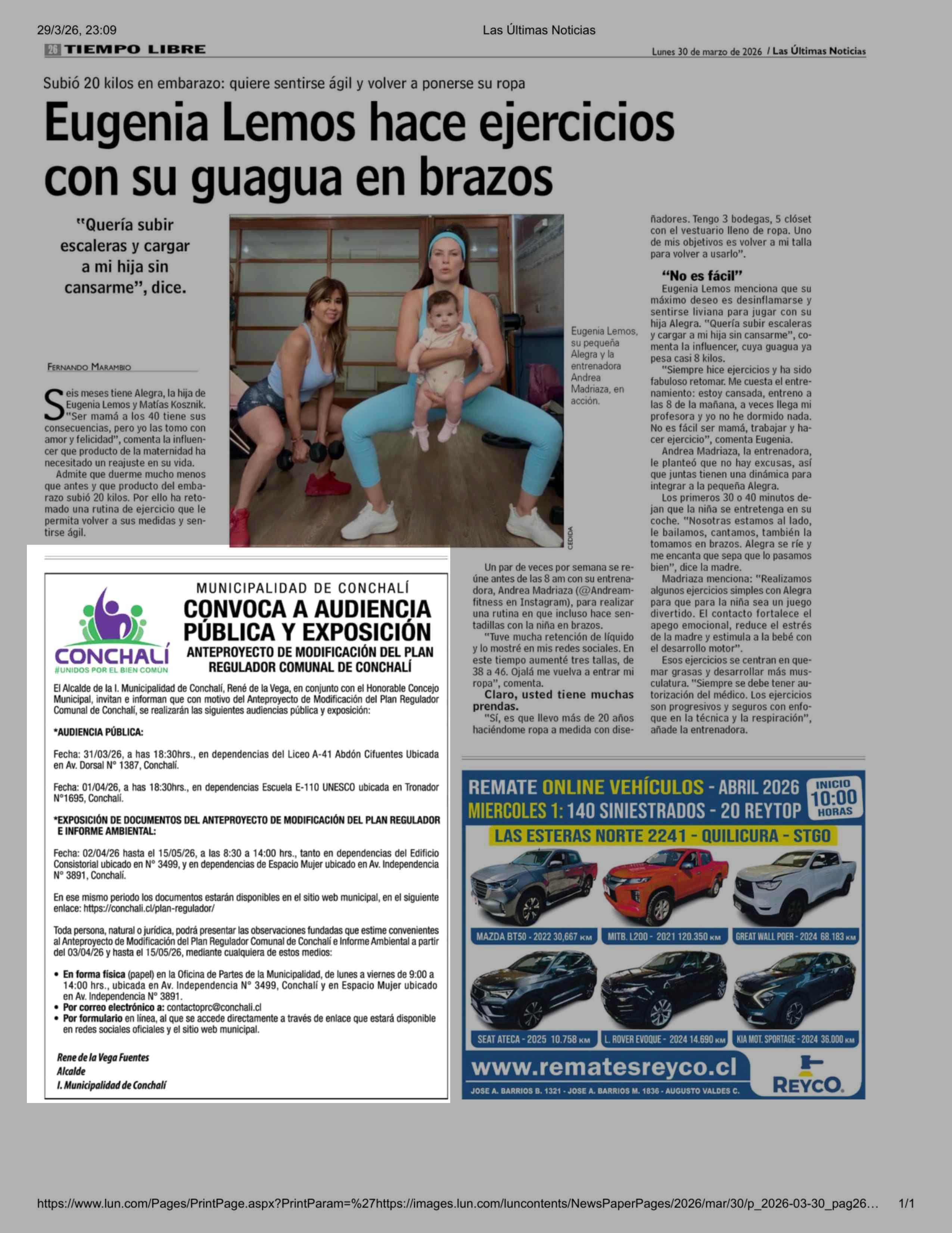 EXTRACTOS: MUNICIPALIDAD DE CONCHALÍ CONVOCA A AUDIENCIA PÚBLICA Y EXPOSICIÓN Í ANTEPROYECTO DE MODIFICACIÓN DEL PLAN A REGULADOR COMUNAL DE CONCHALÍ 30-03-2026 Las Últimas Noticias |