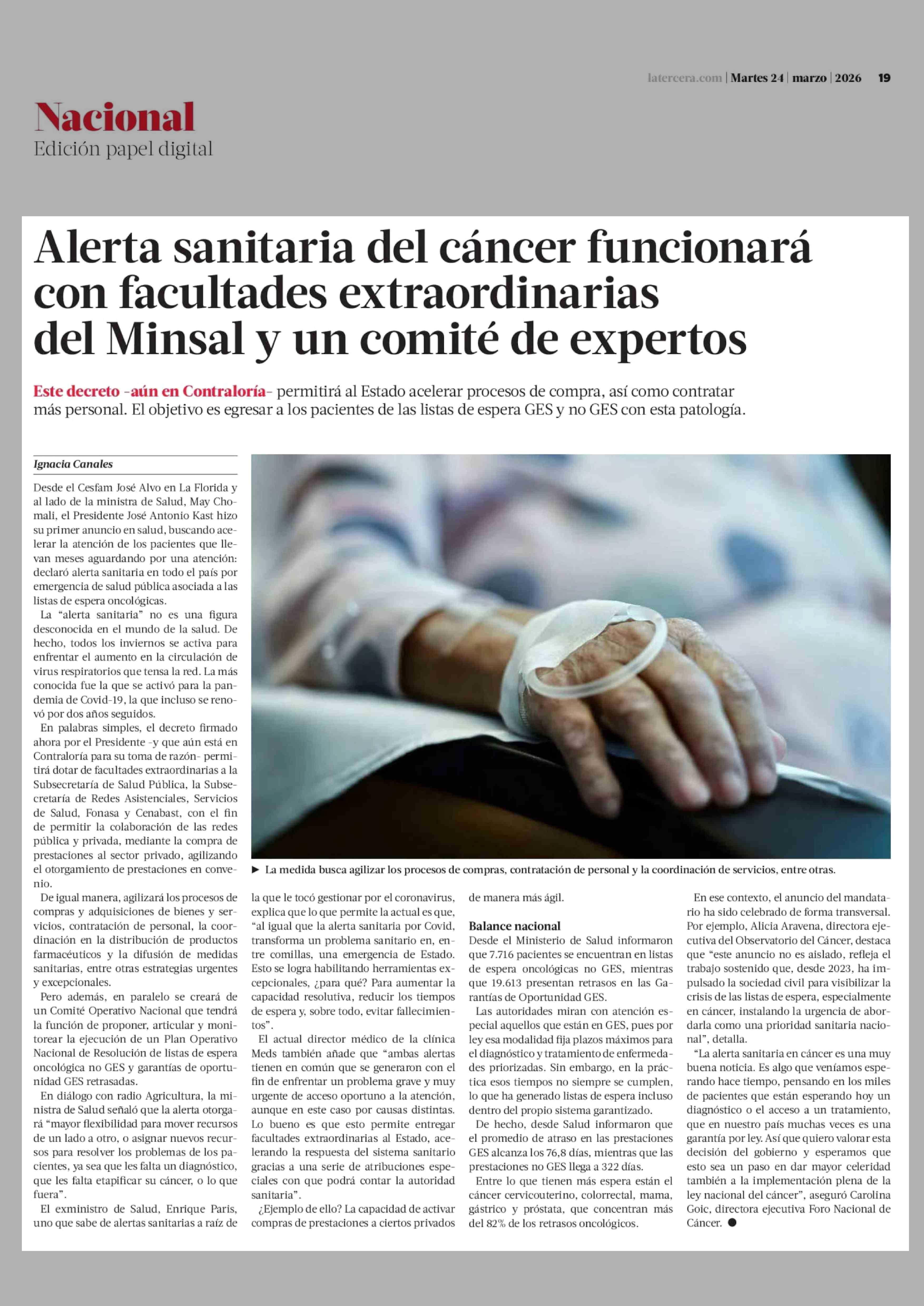 Alerta sanitaria del cáncer funcionará con facultades extraordinarias del Minsal y un comité de expertos 24-03-2026 La Tercera |