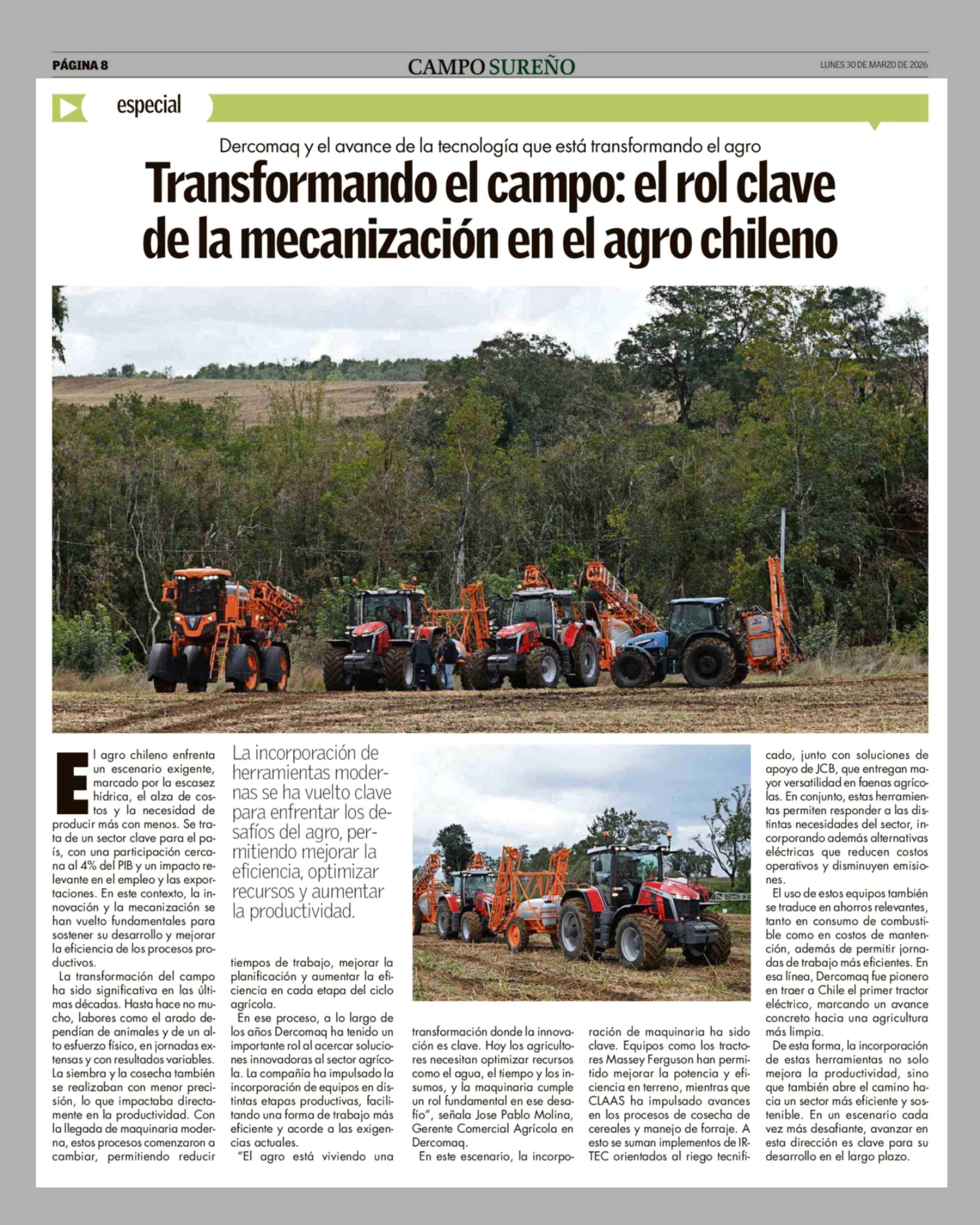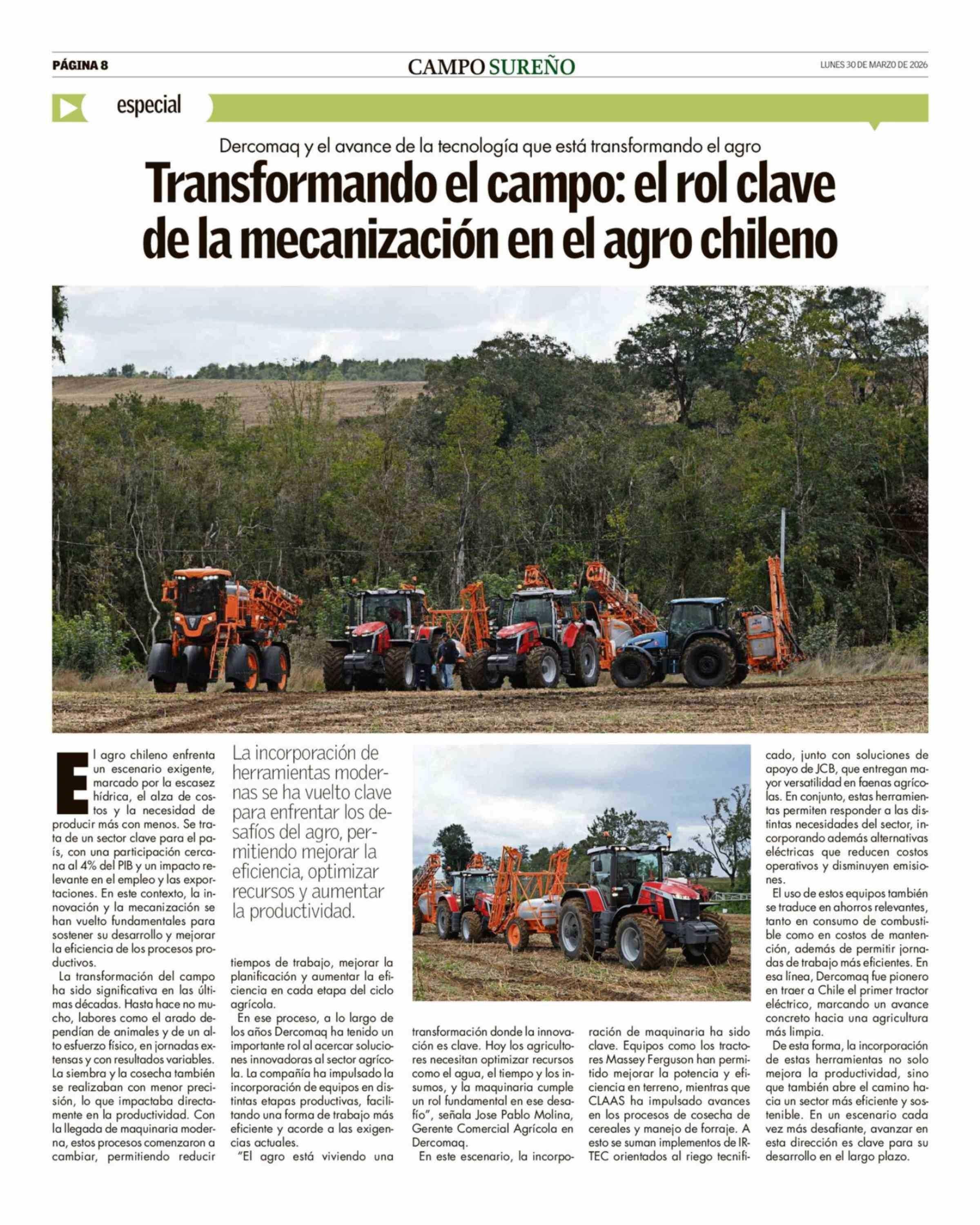 Transformando el campo: el rol clave de la mecanización en el agro chileno 30-03-2026 Campo Sureño - Regiones IX, X y XIV |
