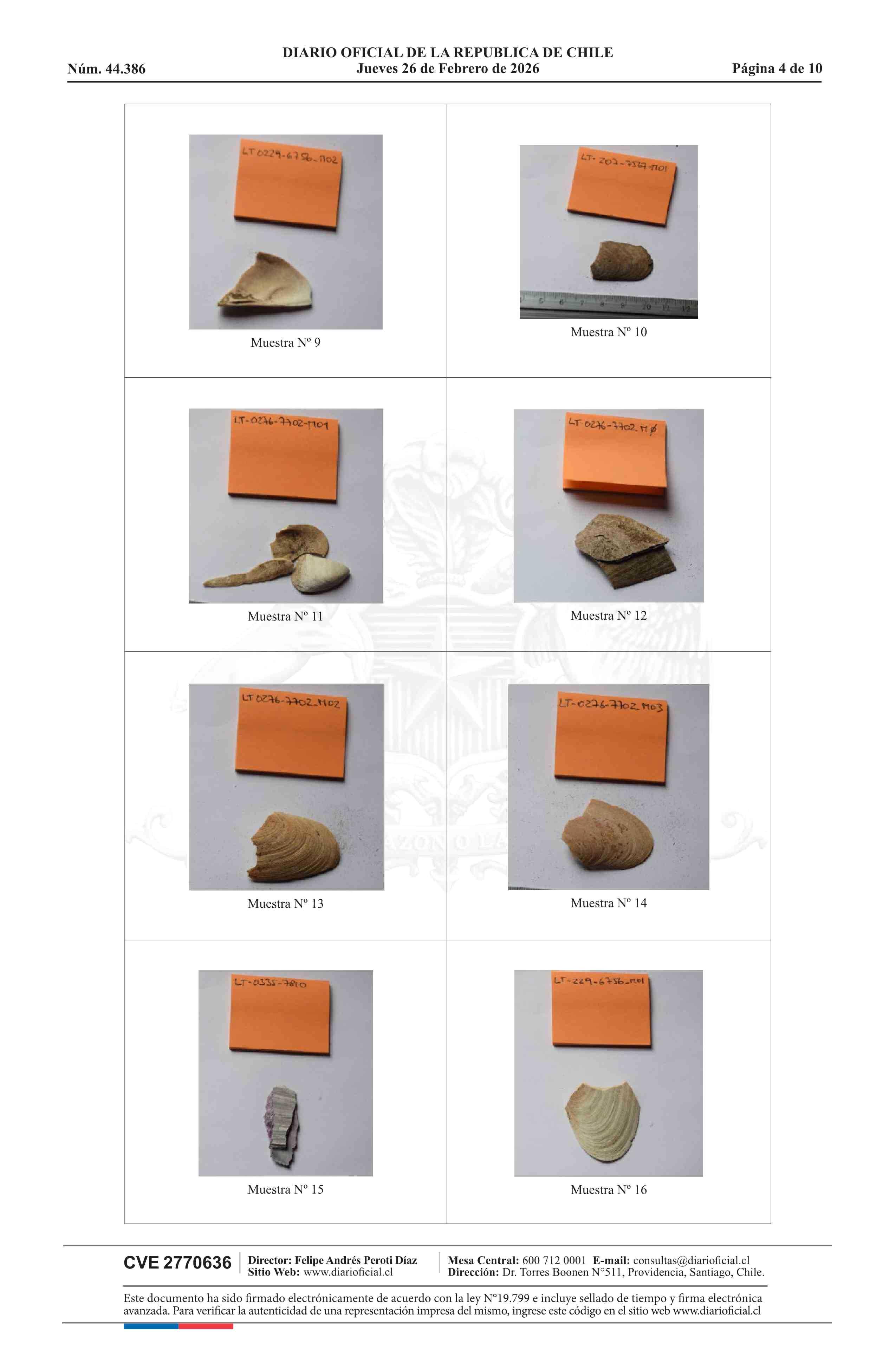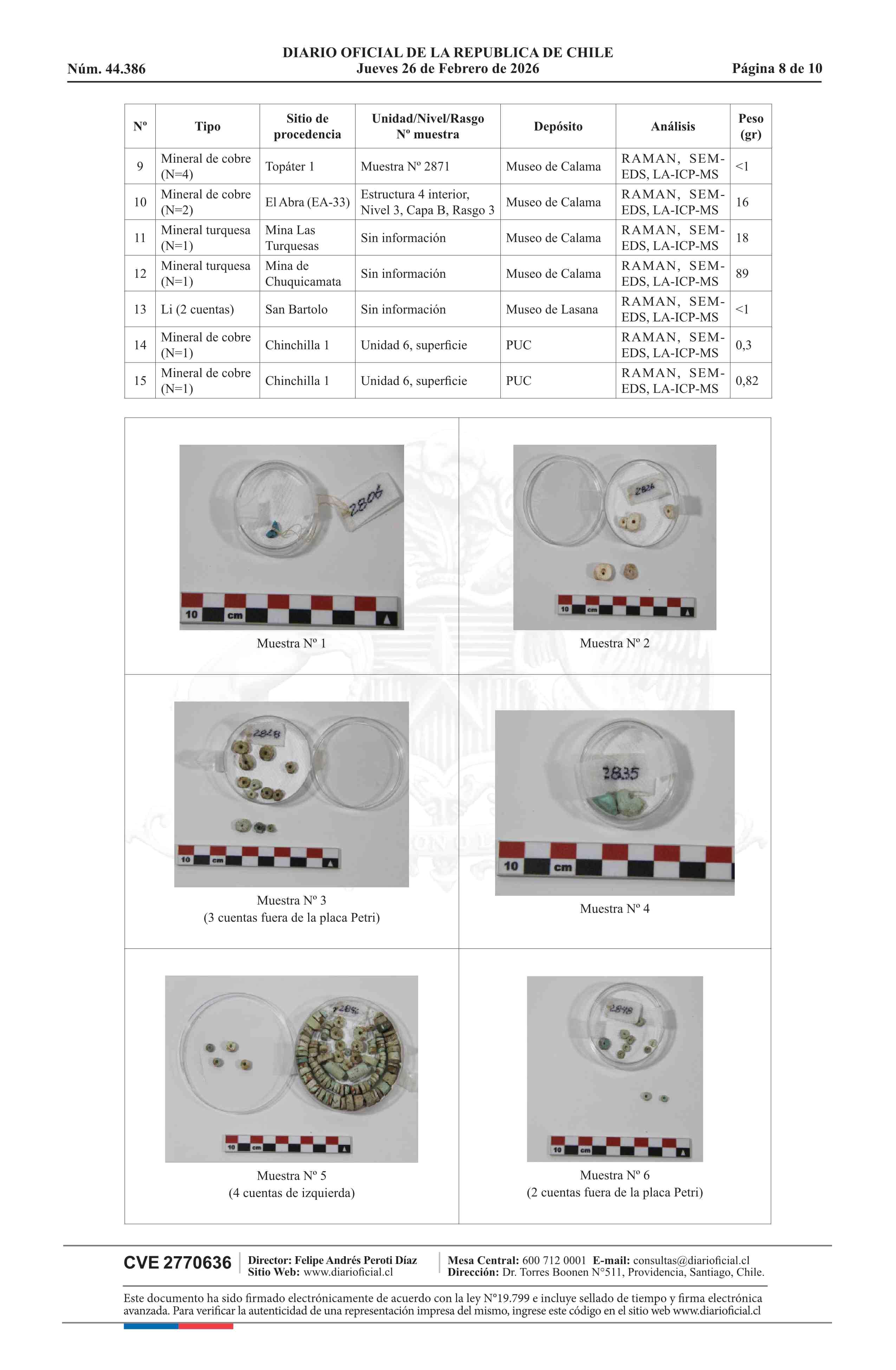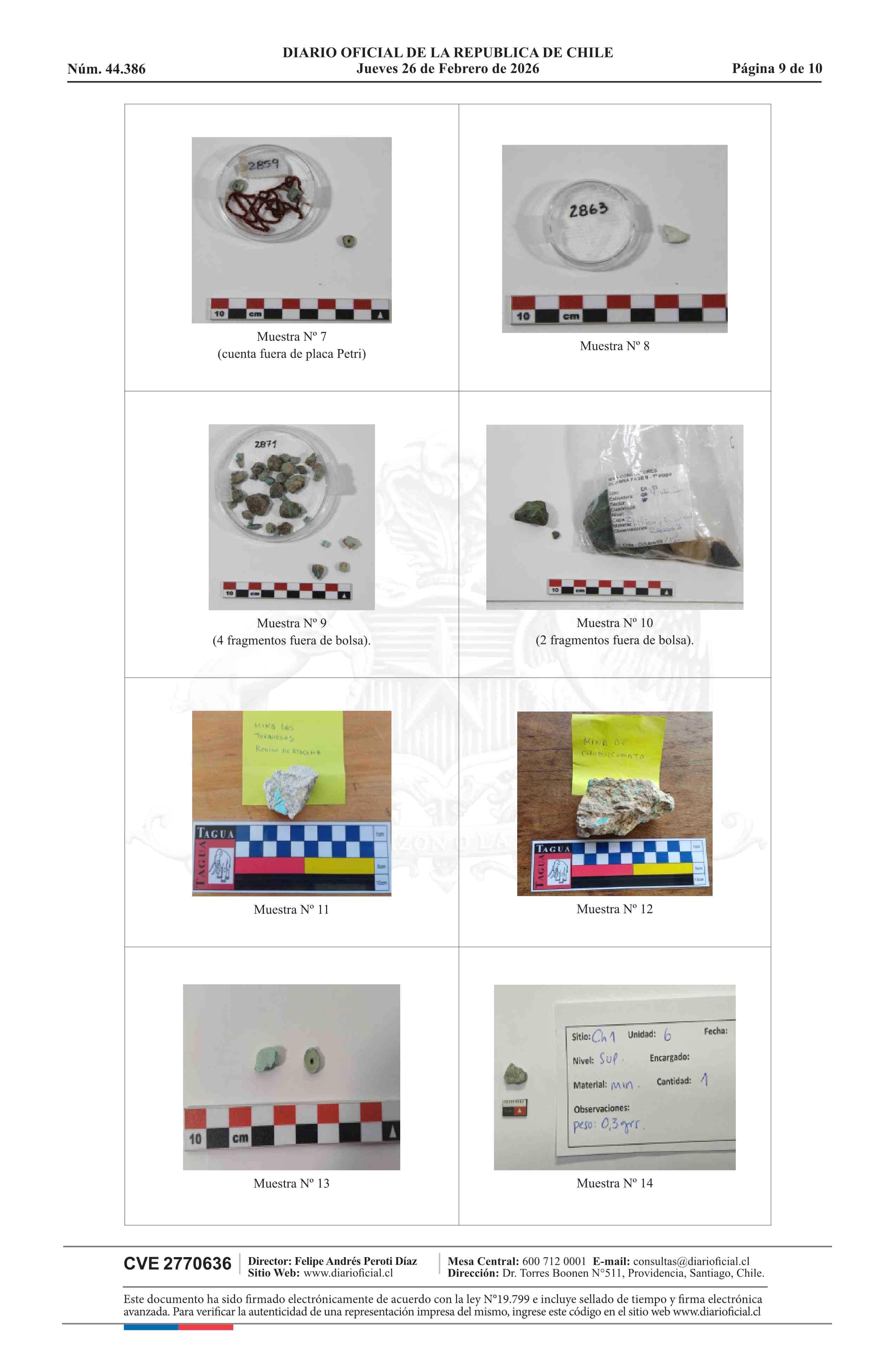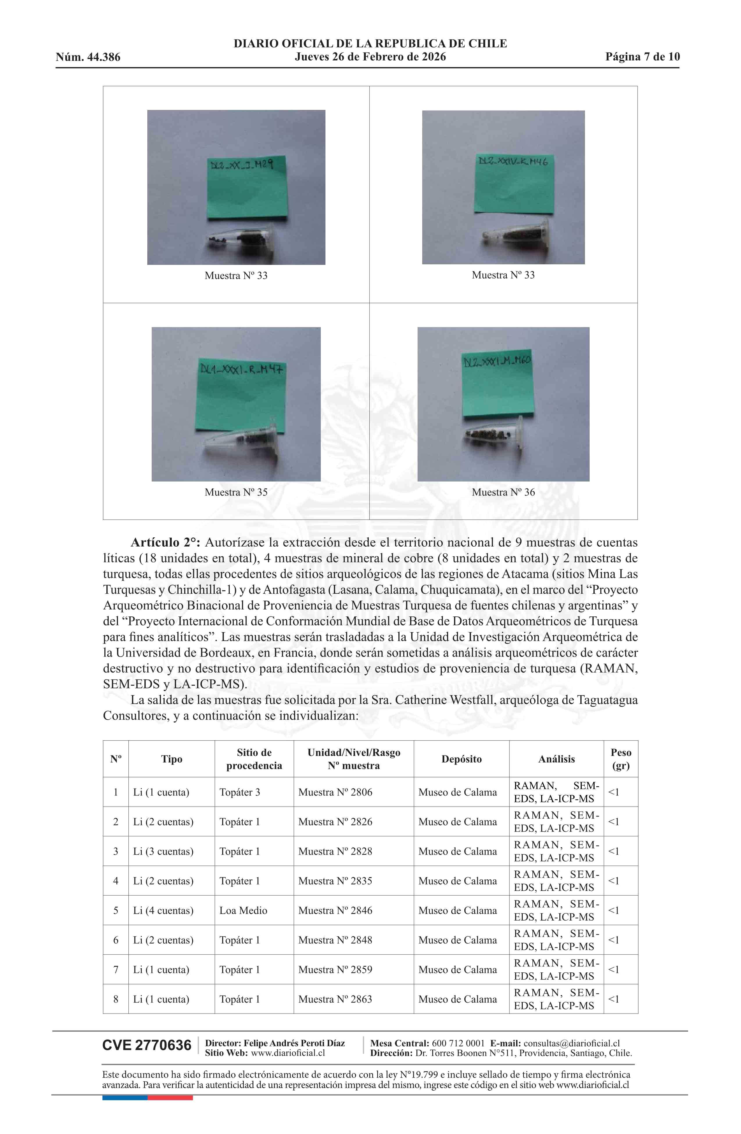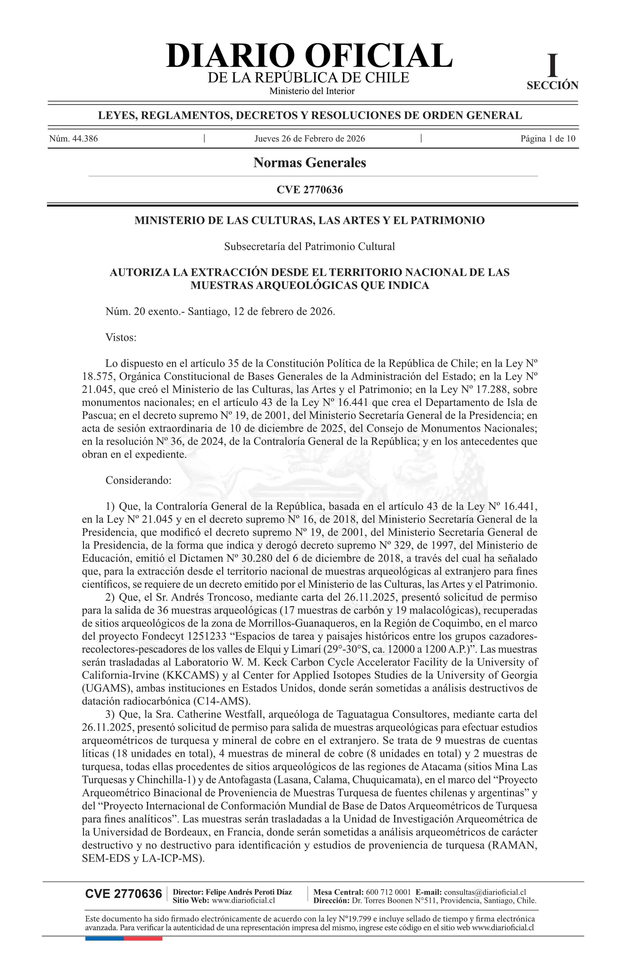 | Título: | Decreto exento número 20, de 2026.- Autoriza la extracción desde el territorio nacional de las muestras arqueológicas que indica |