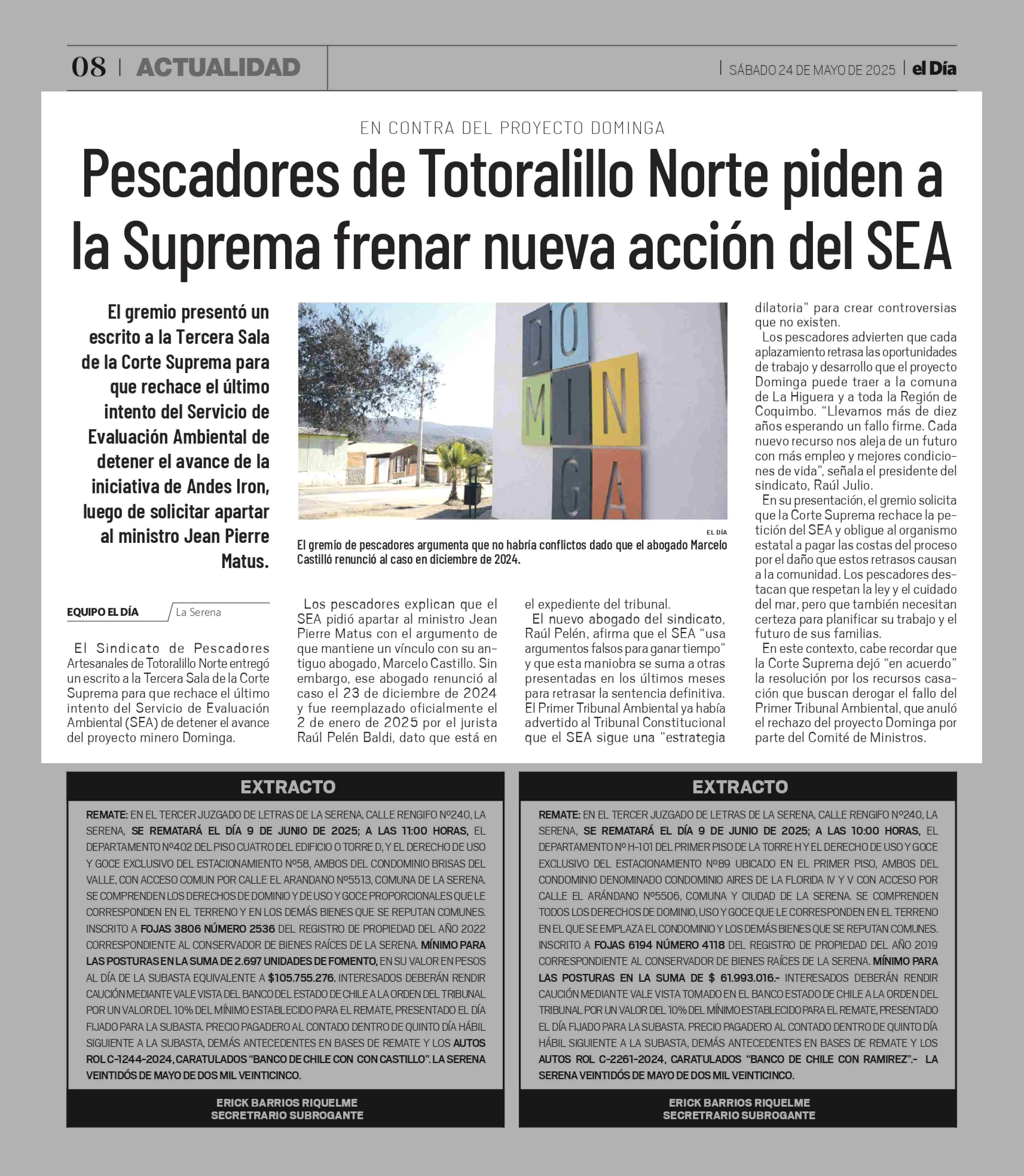 Pescadores de Totoralillo Norte piden a la Suprema frenar nueva acción del SEA 24-05-2025 El Día |