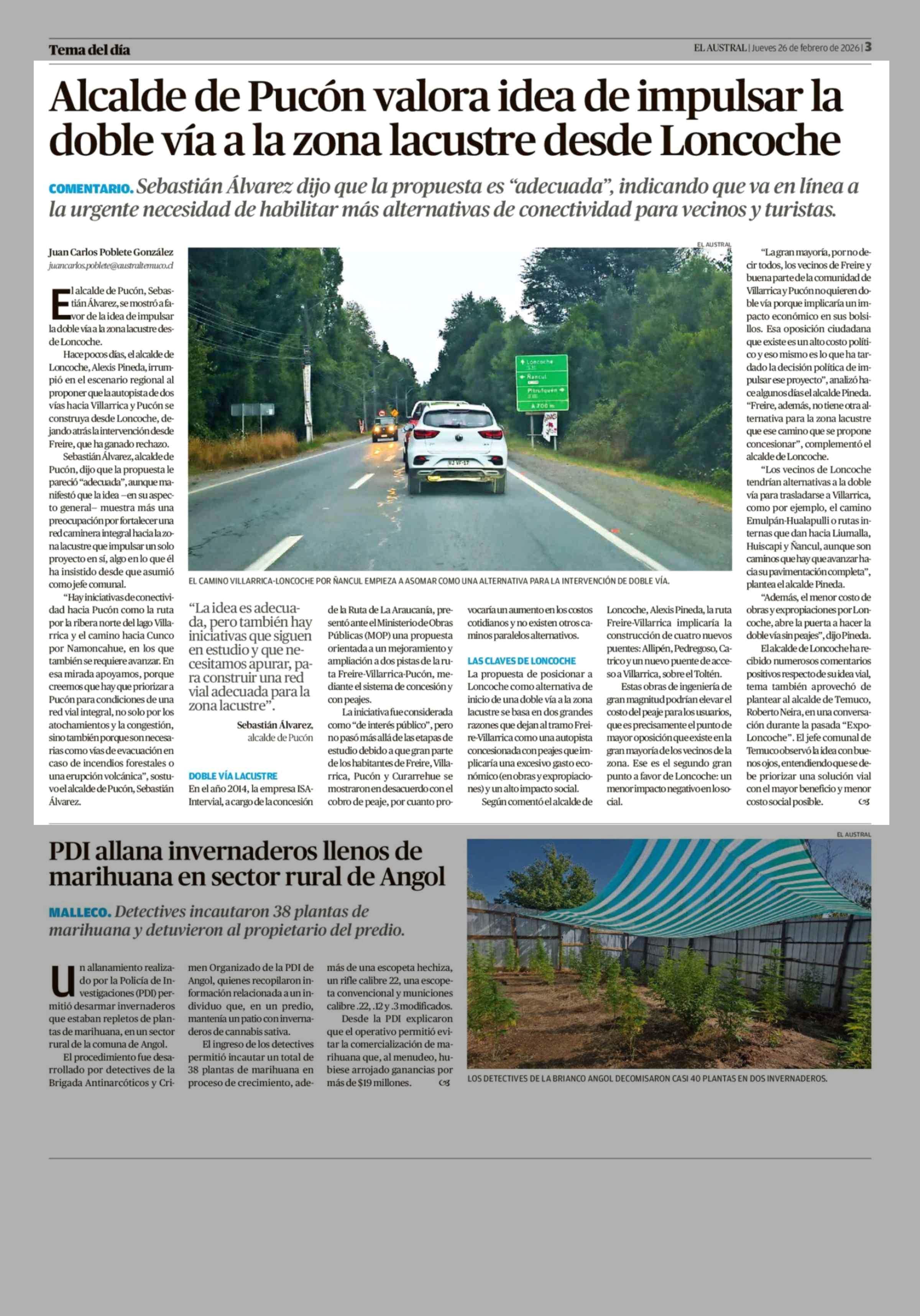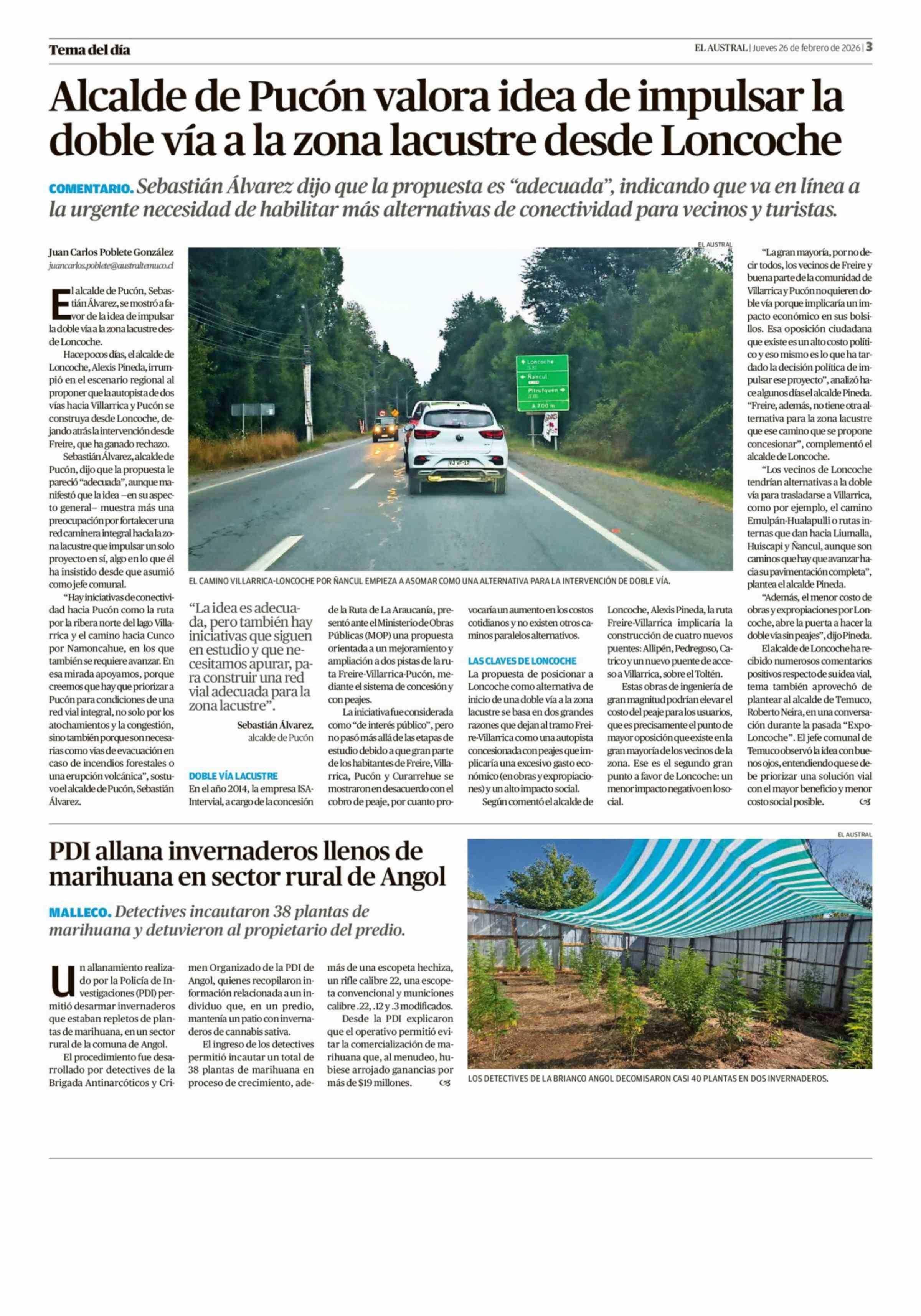 Título: Alcalde de Pucón valora idea de impulsar la doble vía a la zona lacustre desde Loncoche