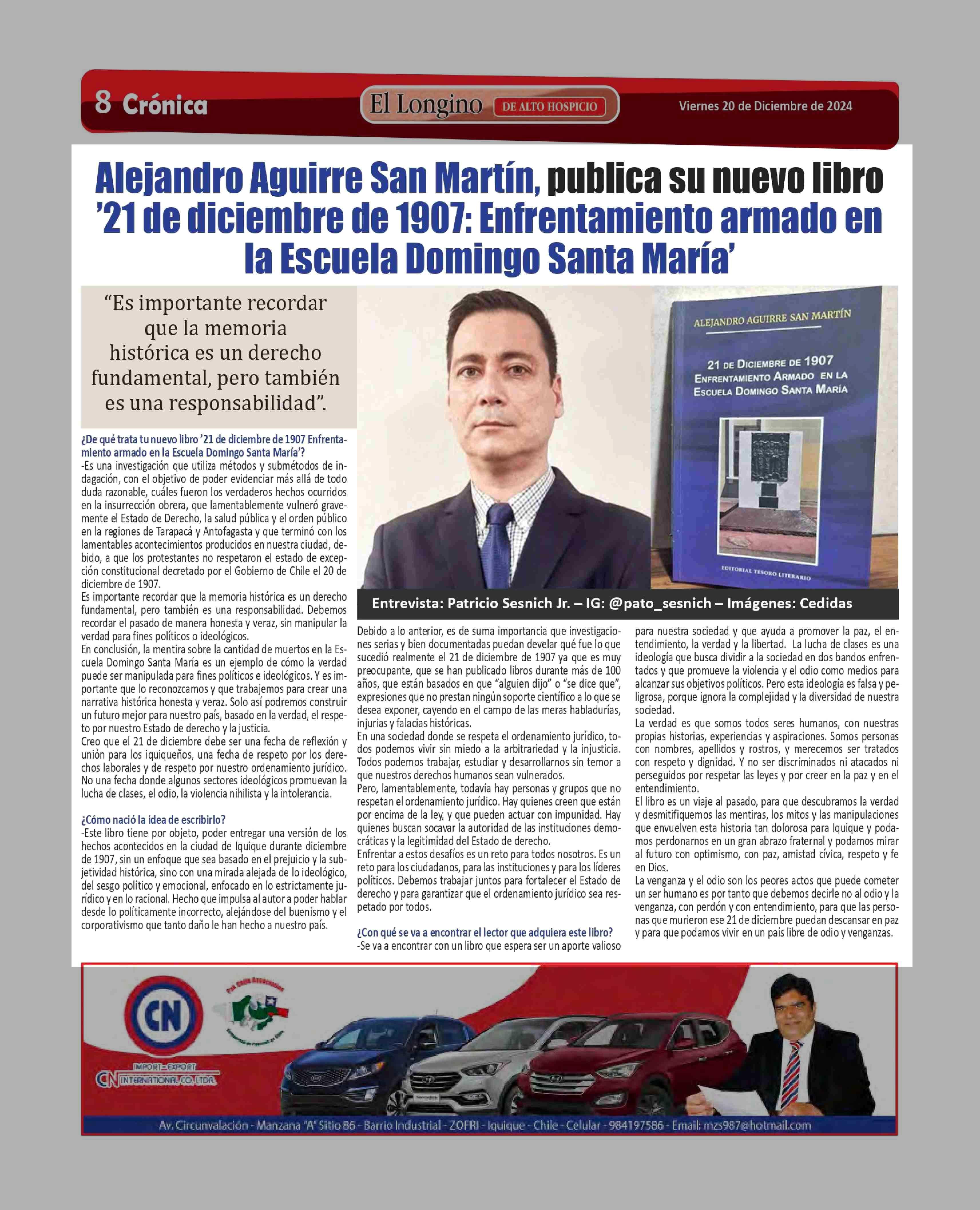 Título: Alejandro Aguirre San Martín, publica su nuevo libro '21 de diciembre de 1907: Enfrentamiento armado en la Escuela Domingo Santa María'