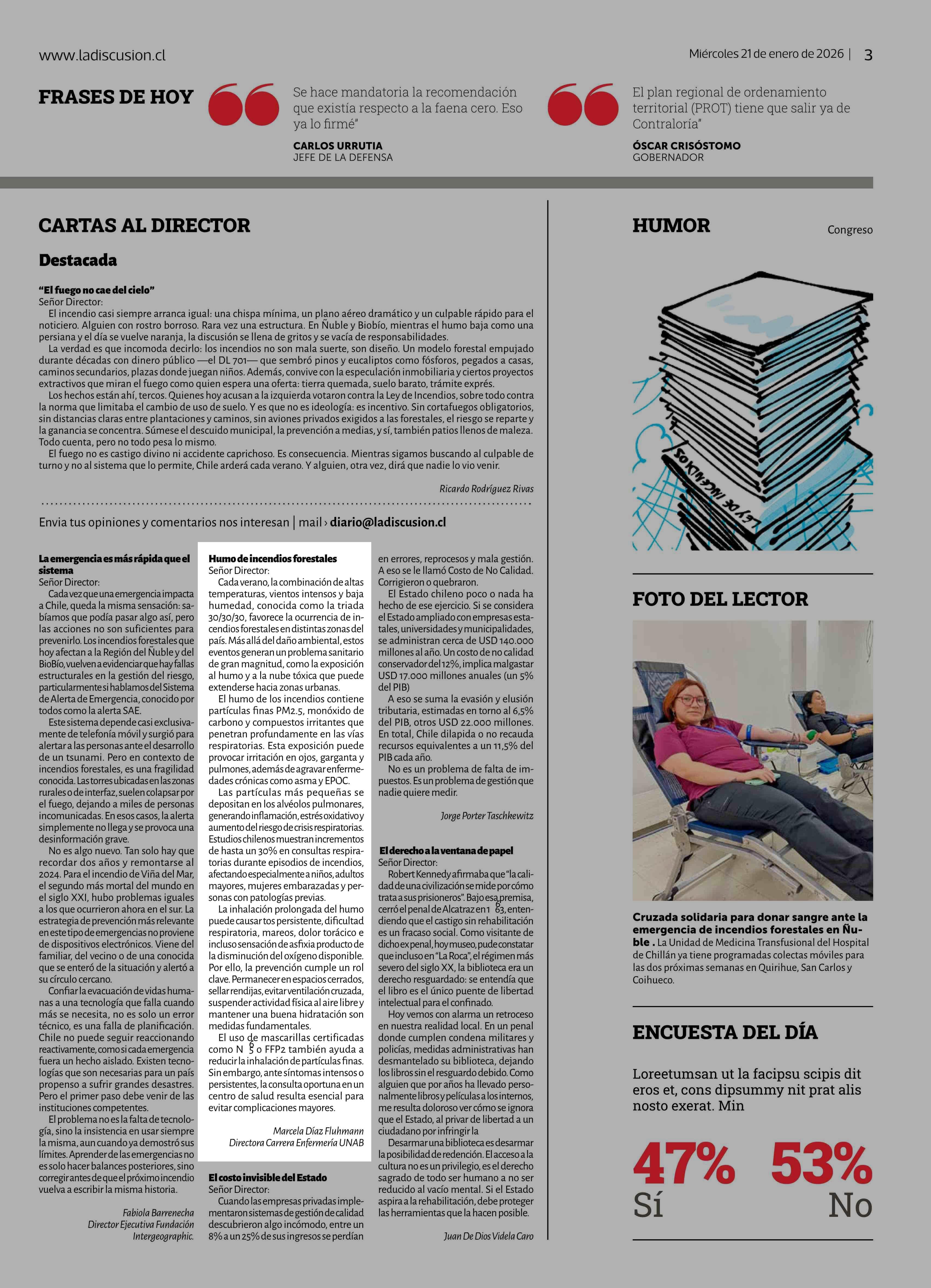 | Título: | Cartas: Humo de incendios forestales Señor Director: Cada verano, la combinación de altas temperaturas, vientos intensos y baja humedad, conocida como la triada 30/30/30, favorece la ocurrencia de incendios forestales en distintas zonas del país. Más allá del daño ambiental, estos eventos generan un |