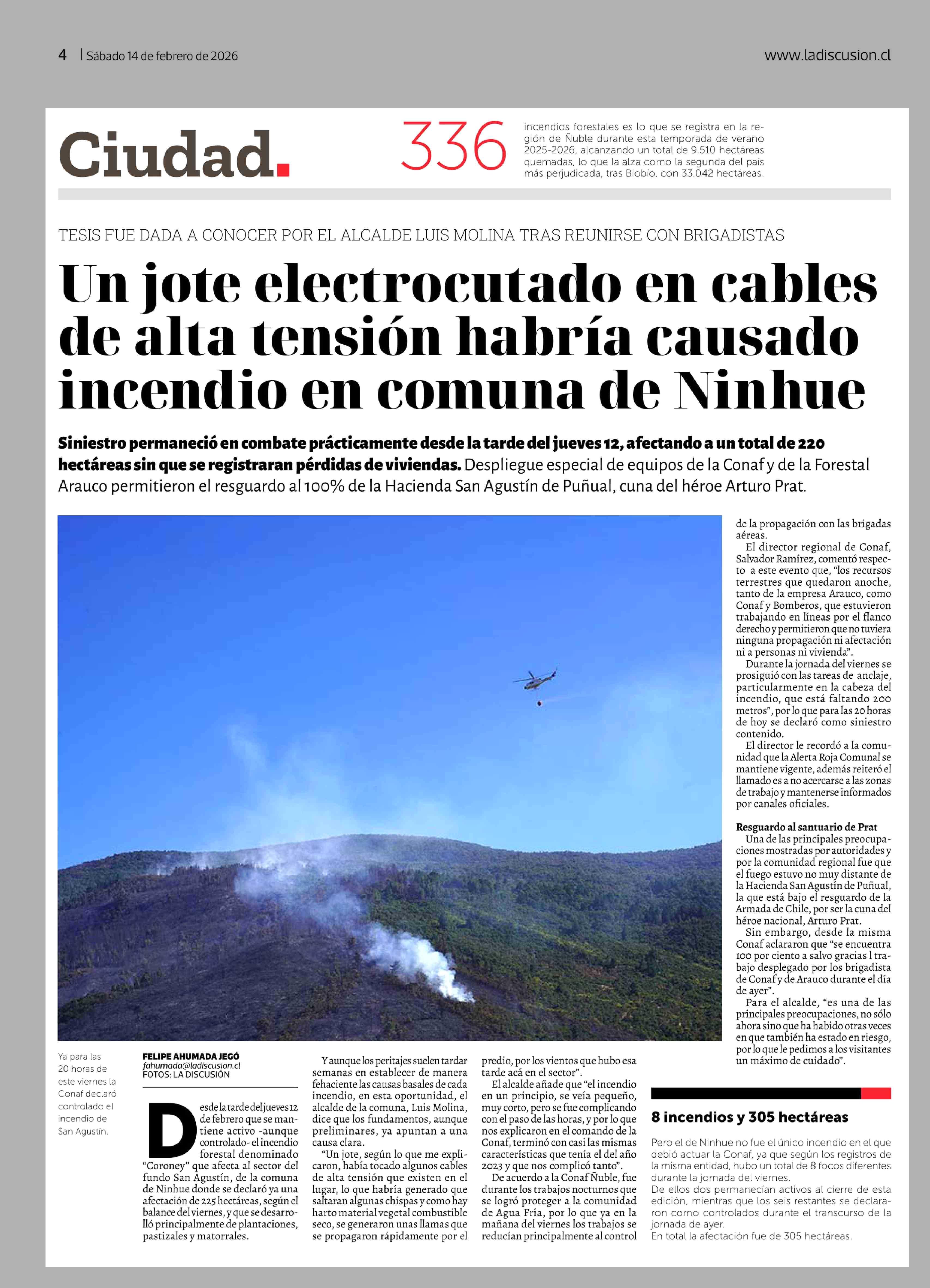 Un jote electrocutado en cables de alta tensión habría causado incendio en comuna de Ninhue 14-02-2026 La Discusión |