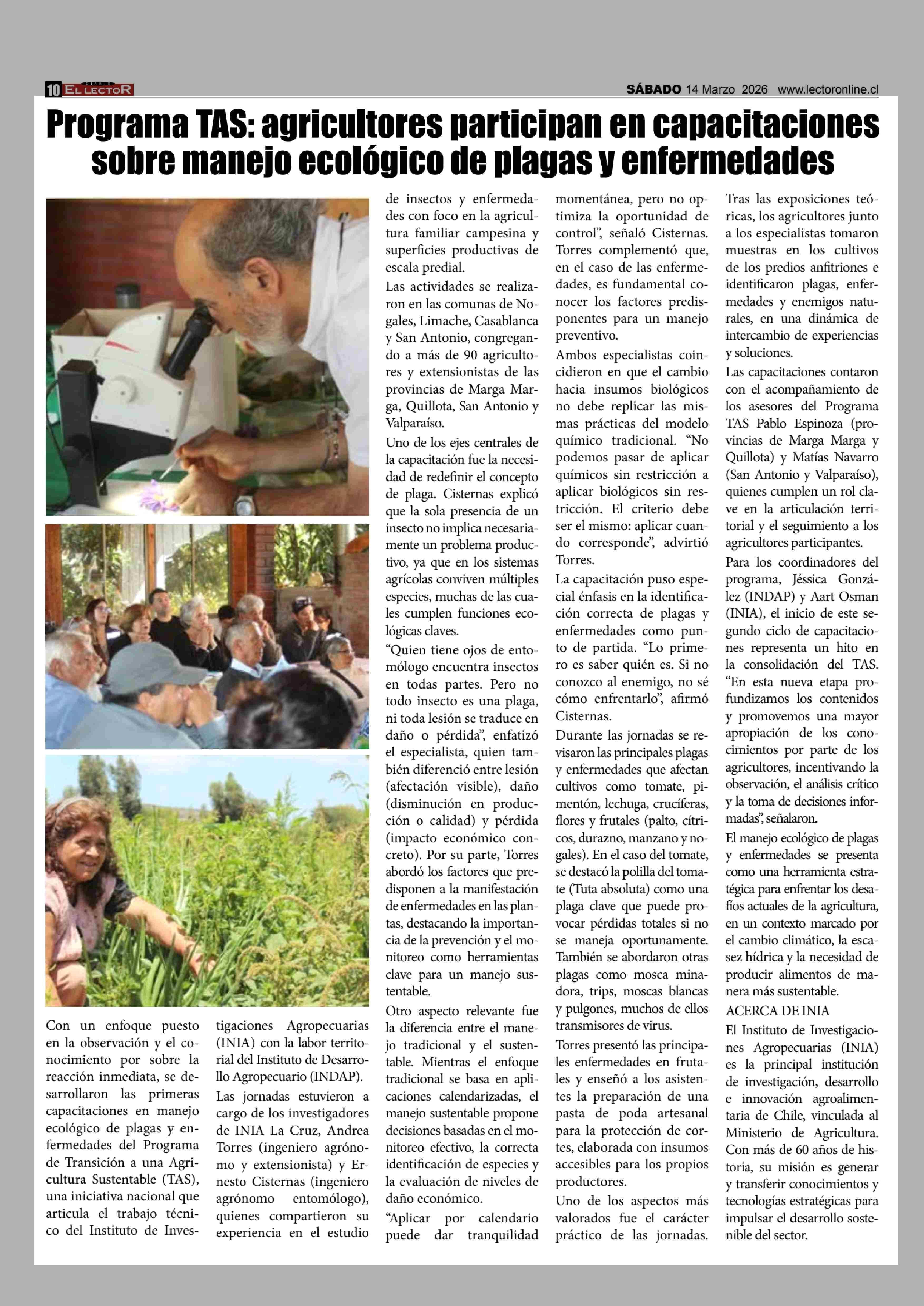 Programa TAS: agricultores participan en capacitaciones sobre manejo ecológico de plagas y enfermedades 14-03-2026 El Lector |