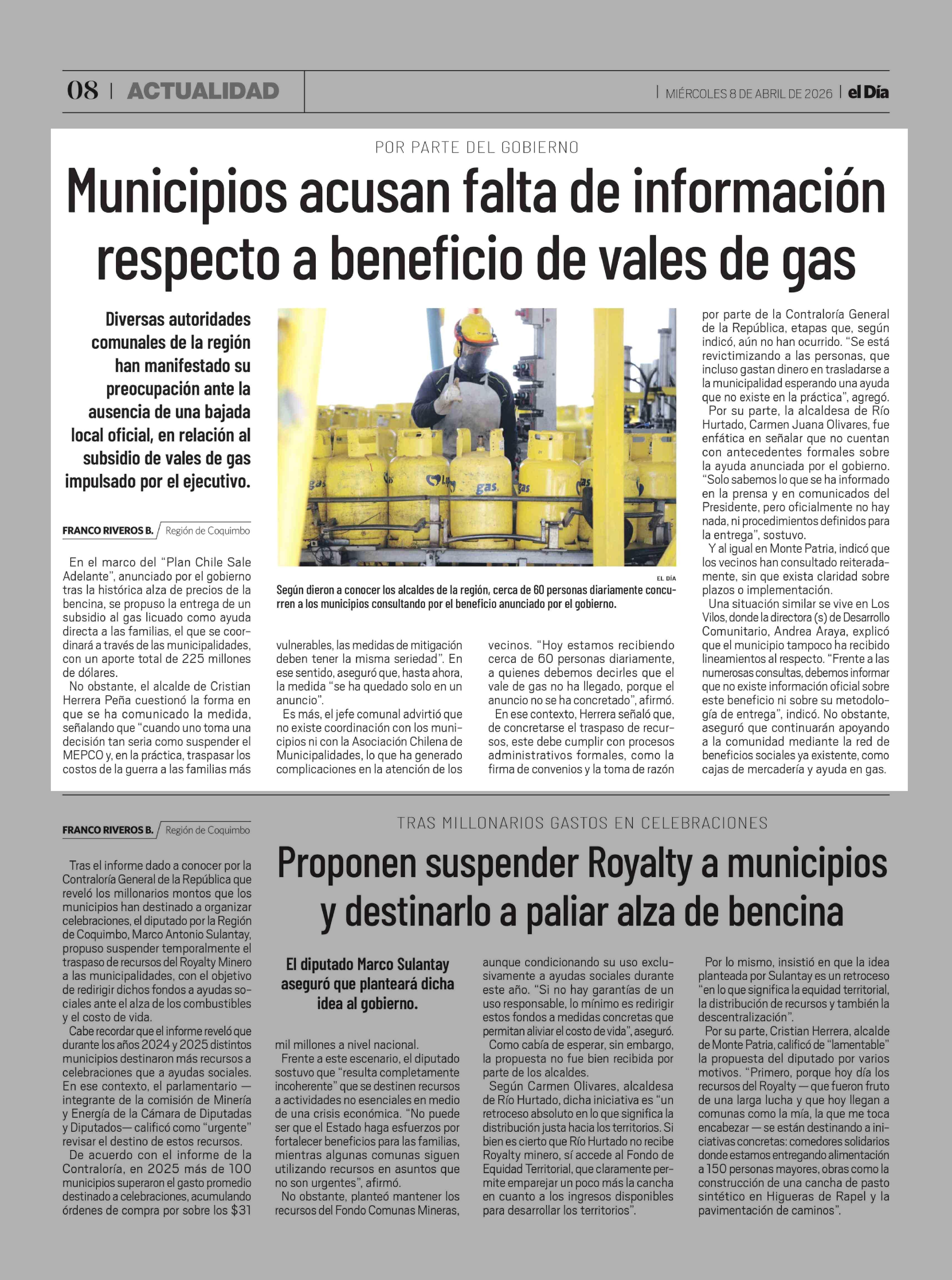 Municipios acusan falta de información respecto a beneficio de vales de gas 08-04-2026 El Día |
