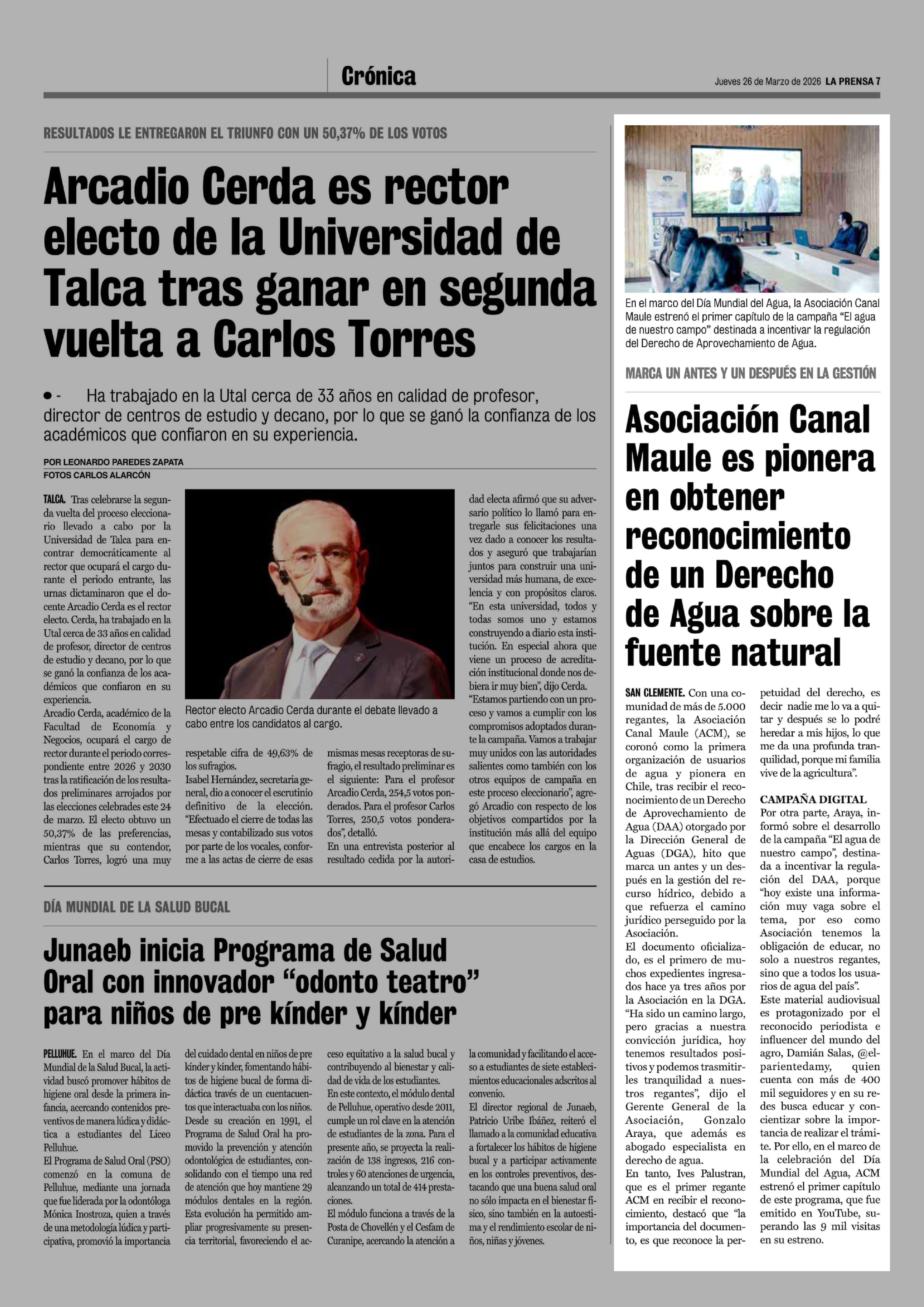 Asociación Canal Maule es pionera en obtener reconocimiento de un Derecho de Agua sobre la fuente natural 26-03-2026 La Prensa de Curicó |