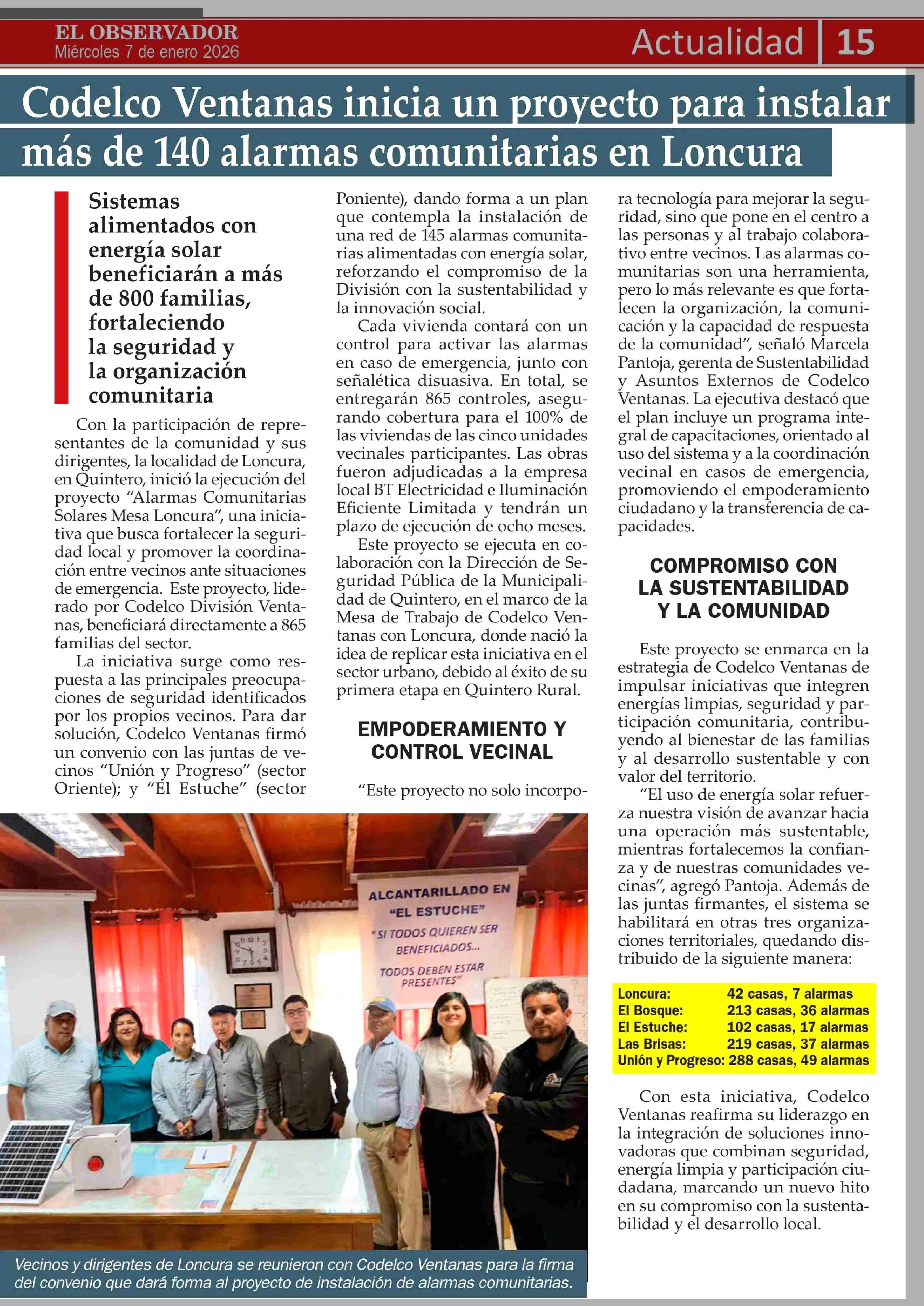 Codelco Ventanas inicia un proyecto para instalar más de 140 alarmas comunitarias en Loncura 07-01-2026 El Observador Vespertino |