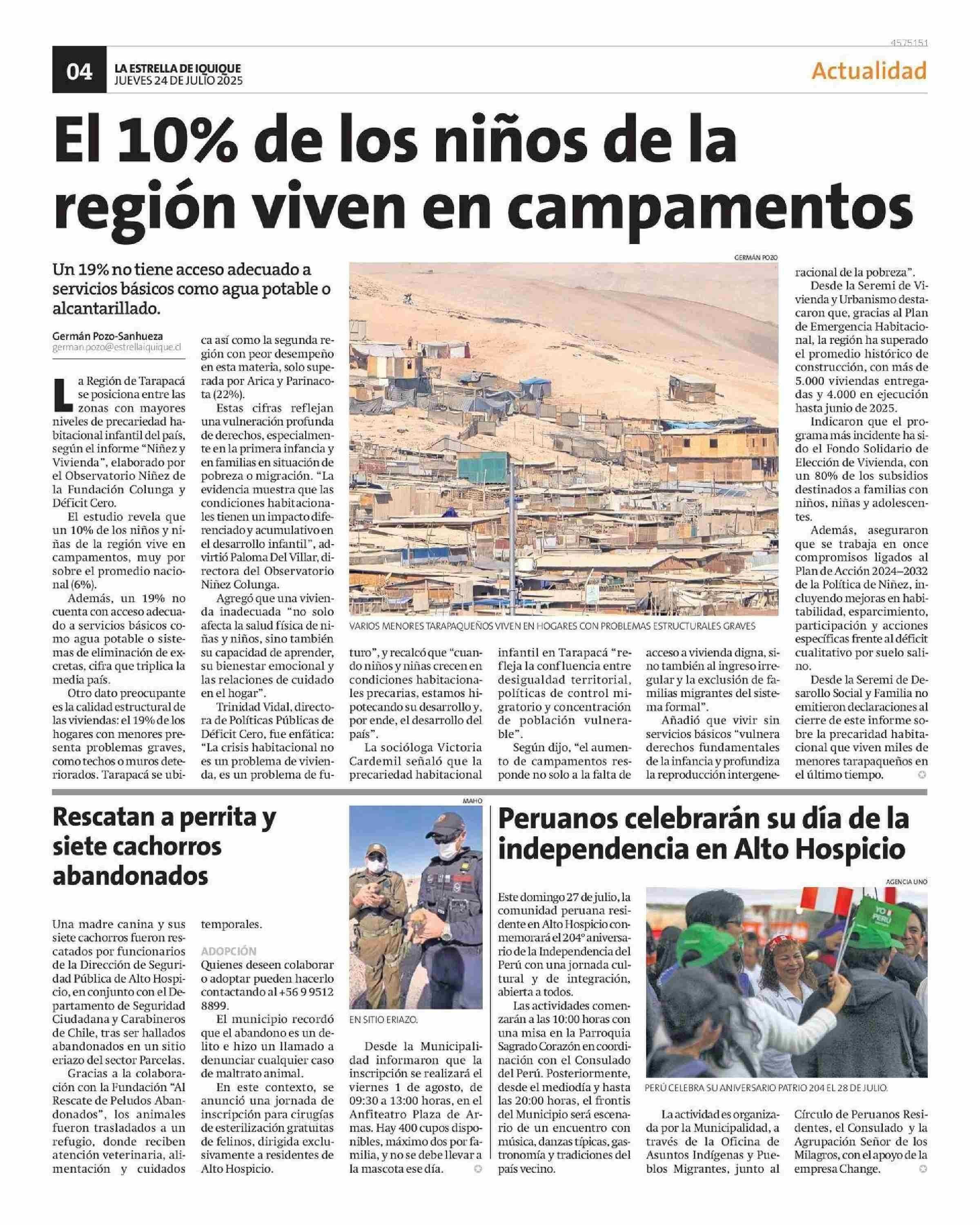 El 10% de los niños de la región viven en campamentos 24-07-2025 La Estrella de Iquique |