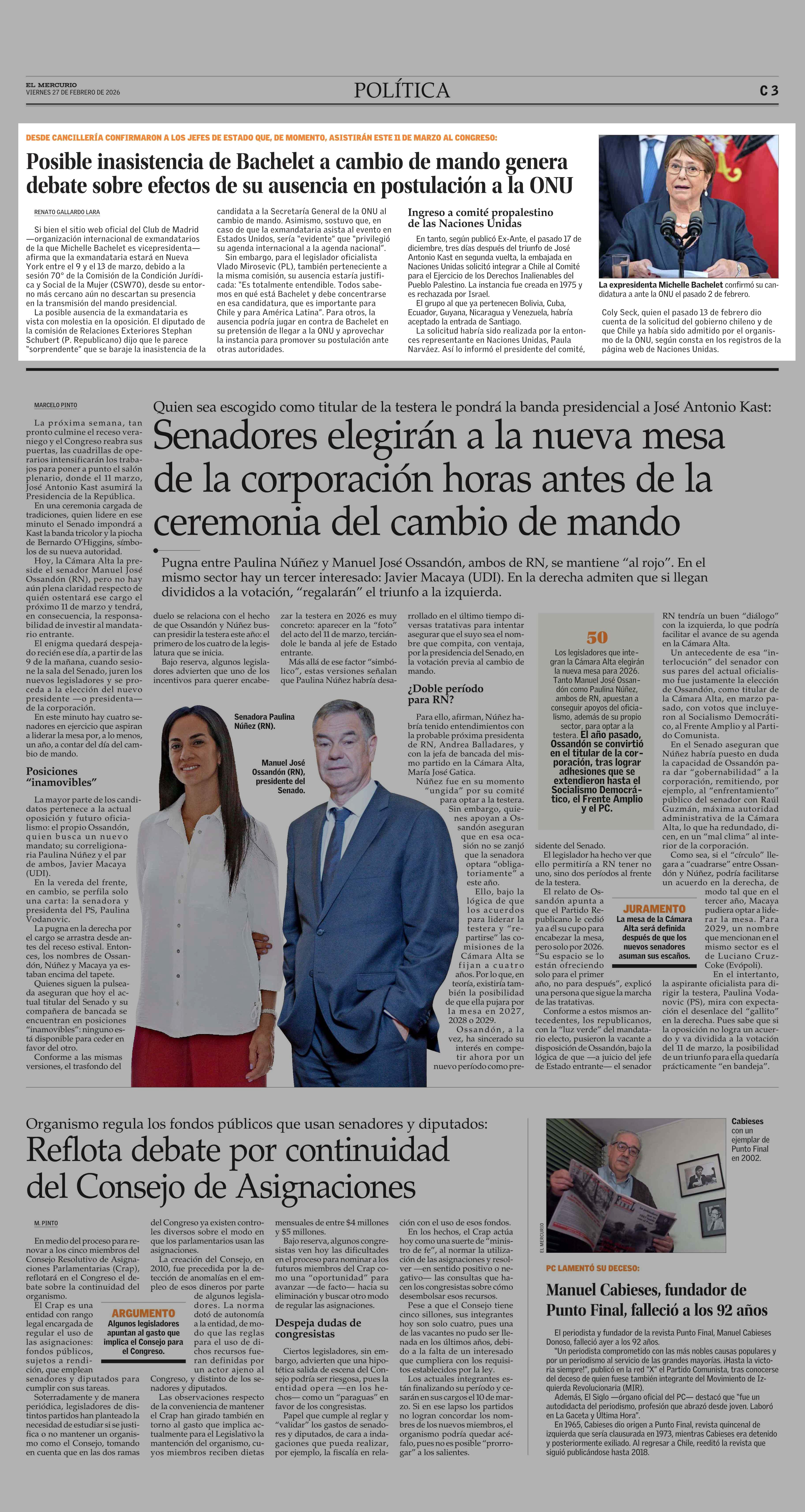 Posible inasistencia de Bachelet a cambio de mando genera debate sobre efectos de su ausencia en postulación a la ONU 27-02-2026 El Mercurio |