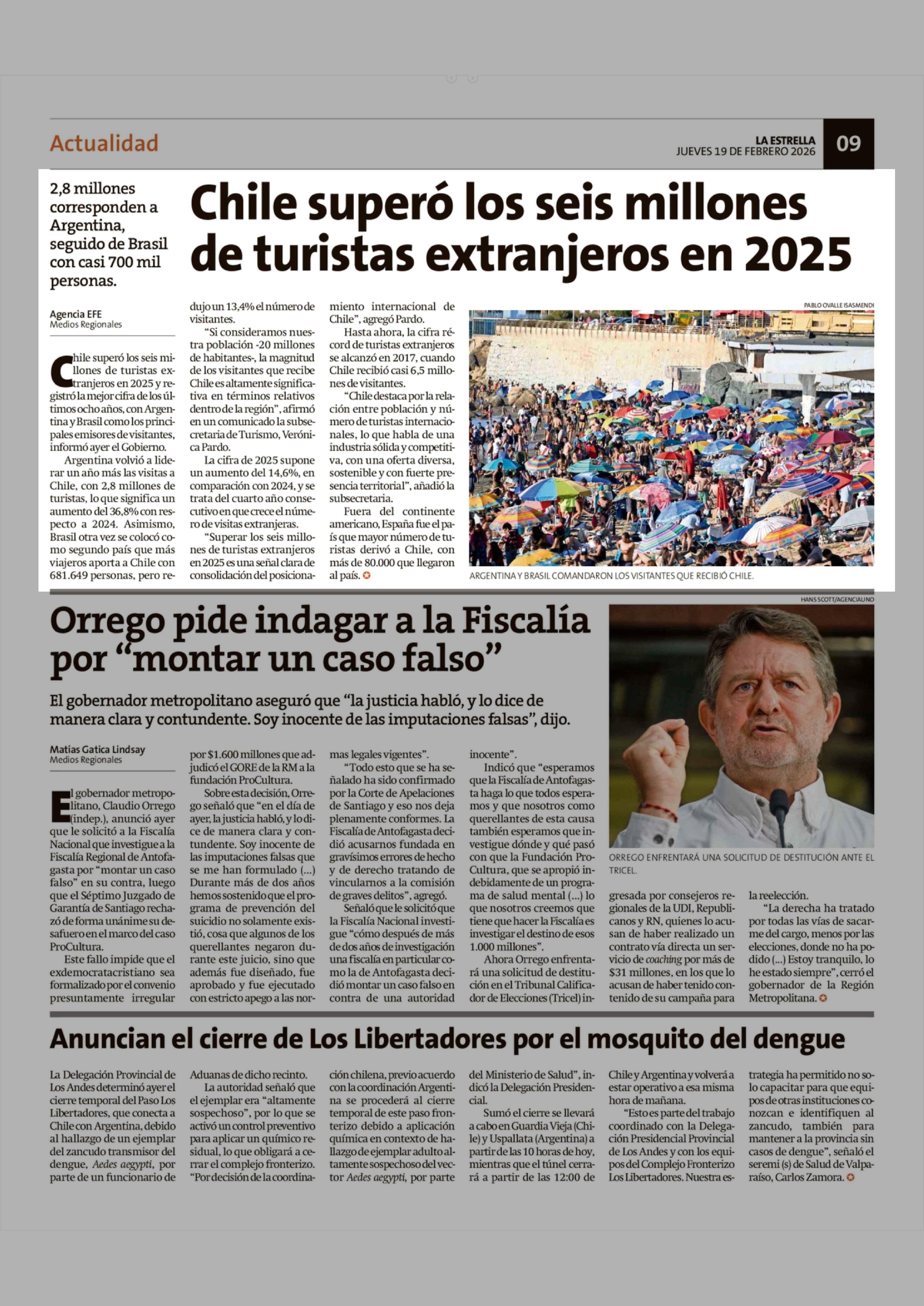 Chile superó los seis millones de turistas extranjeros en 2025 19-02-2026 La Estrella de Chiloé |