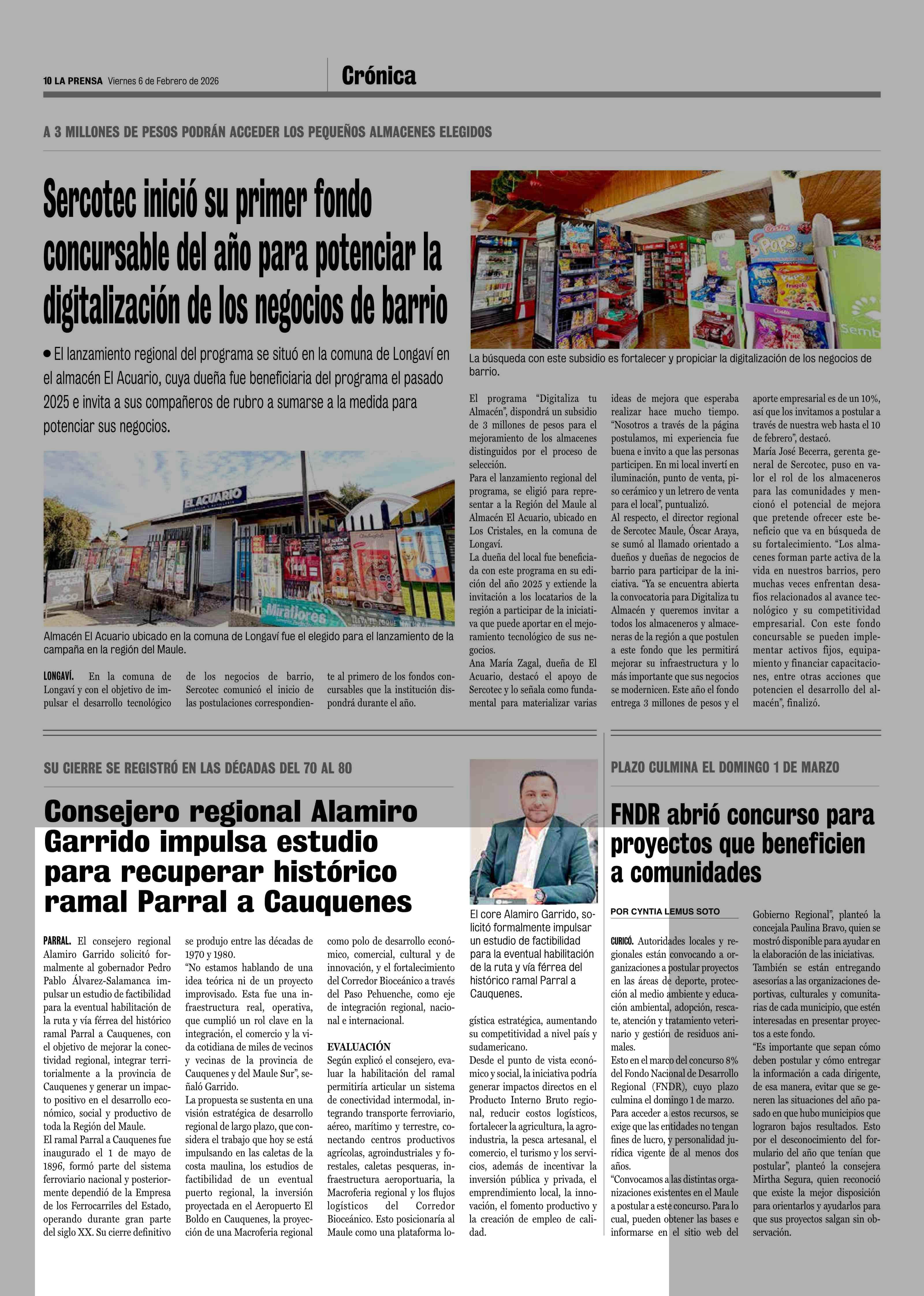 Consejero regional Alamiro Garrido impulsa estudio para recuperar histórico ramal Parral a Cauquenes 06-02-2026 La Prensa de Curicó |