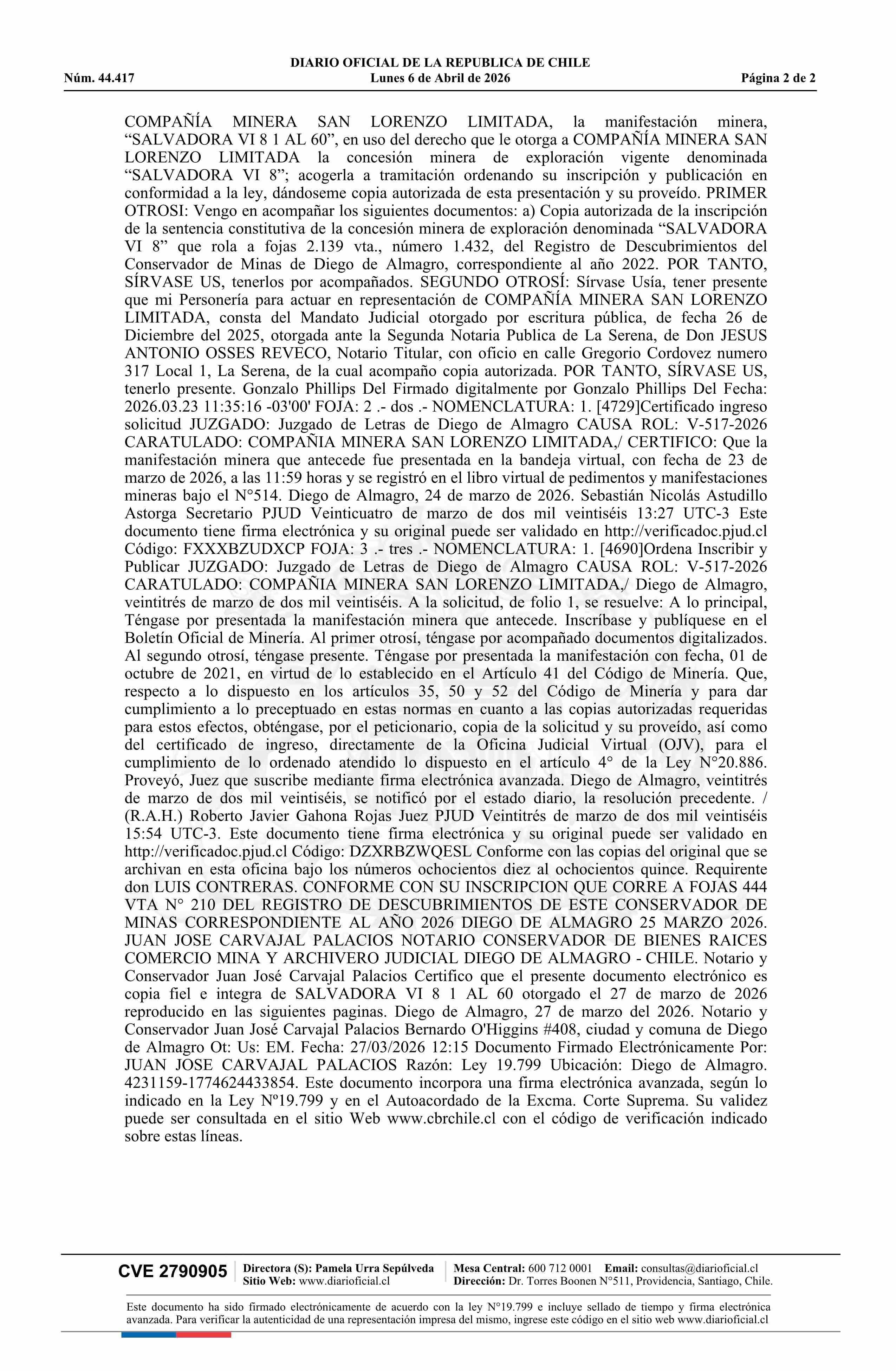 SALVADORA VI 8 1 AL 60 / Compañía Minera San Lorenzo Limitada 06-04-2026 DIARIO OFICIAL CHILE - BOLETÍN OFICIAL DE MINERÍA |