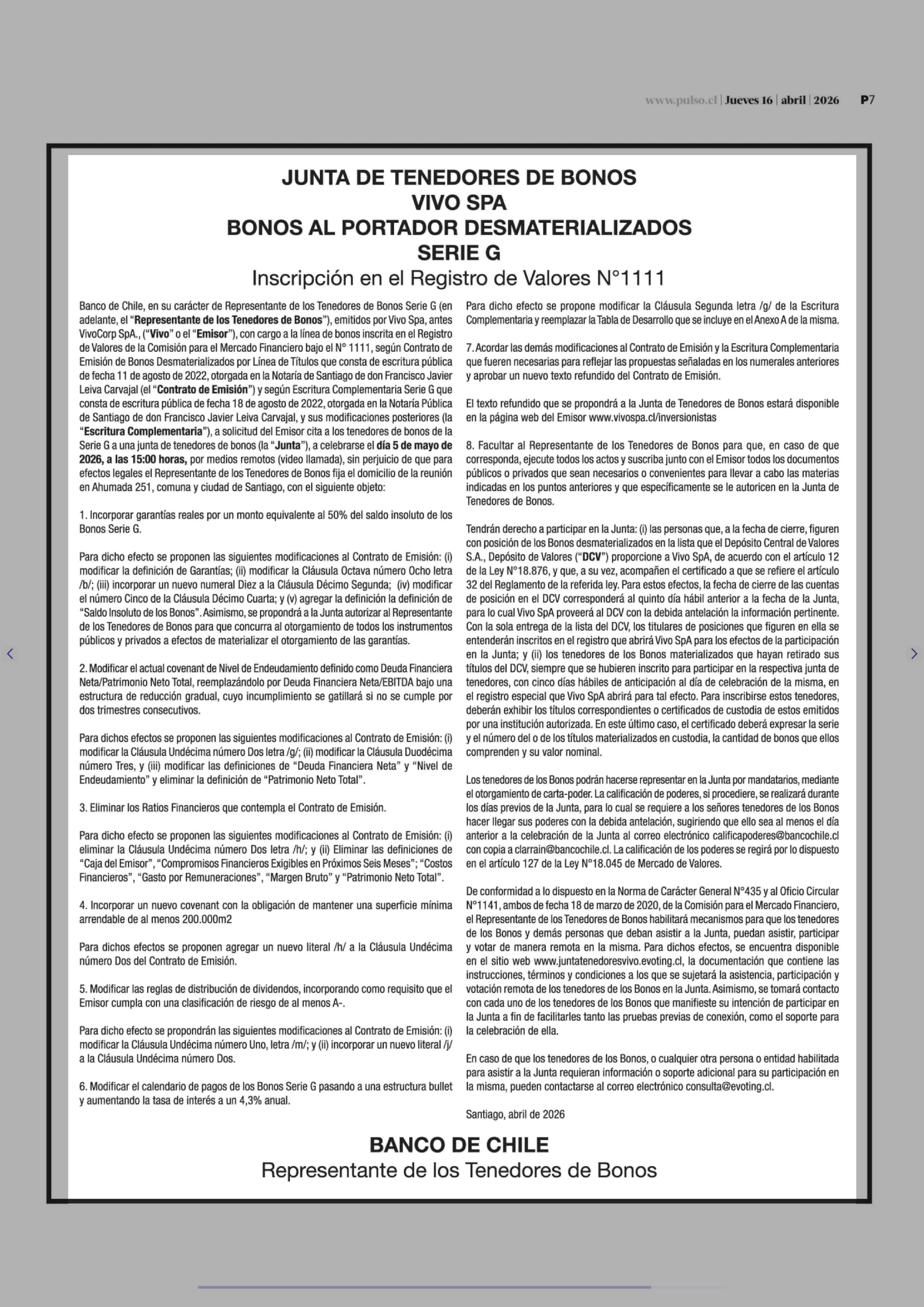 Extractos: BANCO DE CHILE Representante de los Tenedores de Bonos 16-04-2026 La Tercera |