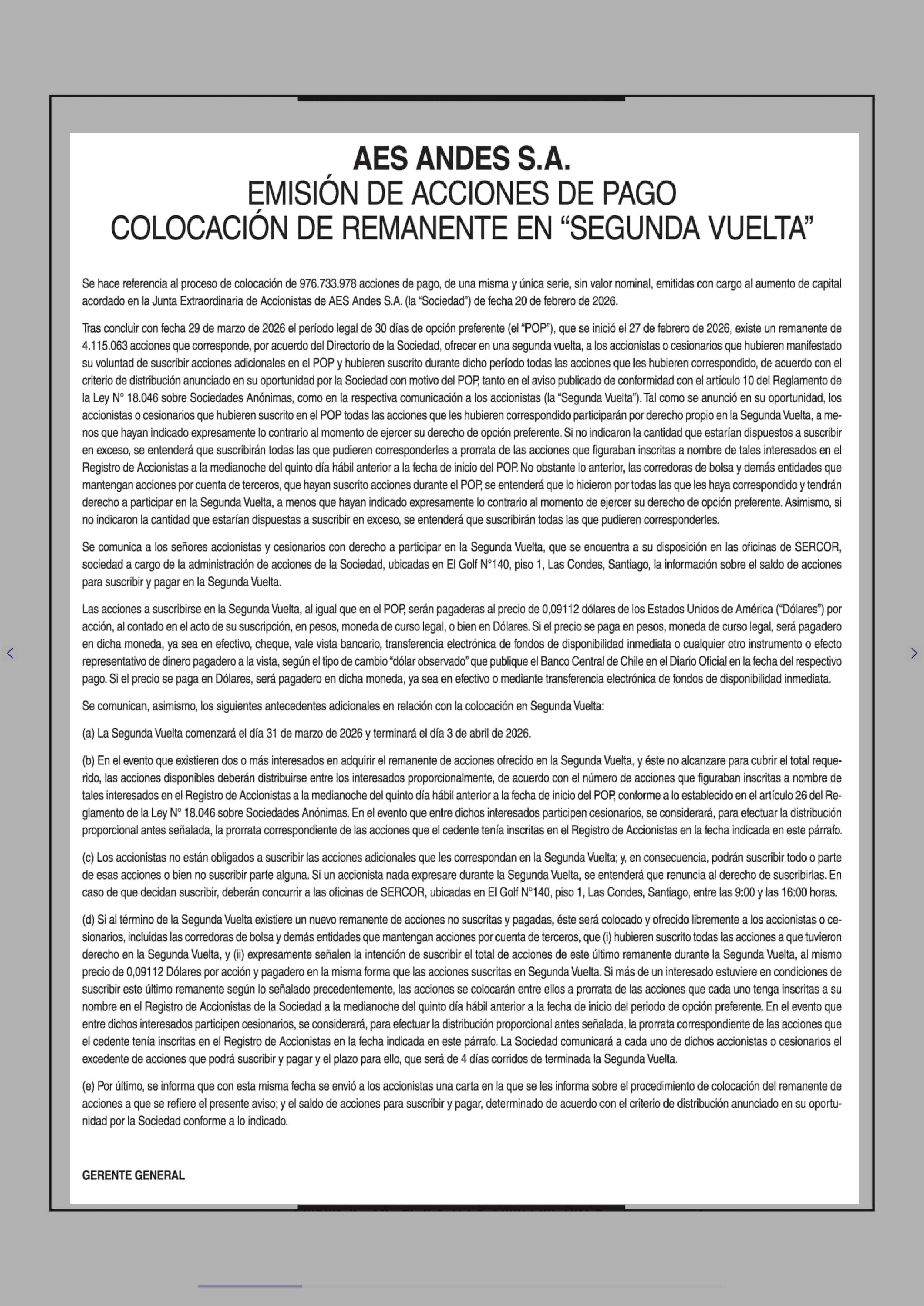 Extractos: AES ANDES S.A. 31-03-2026 La Tercera |