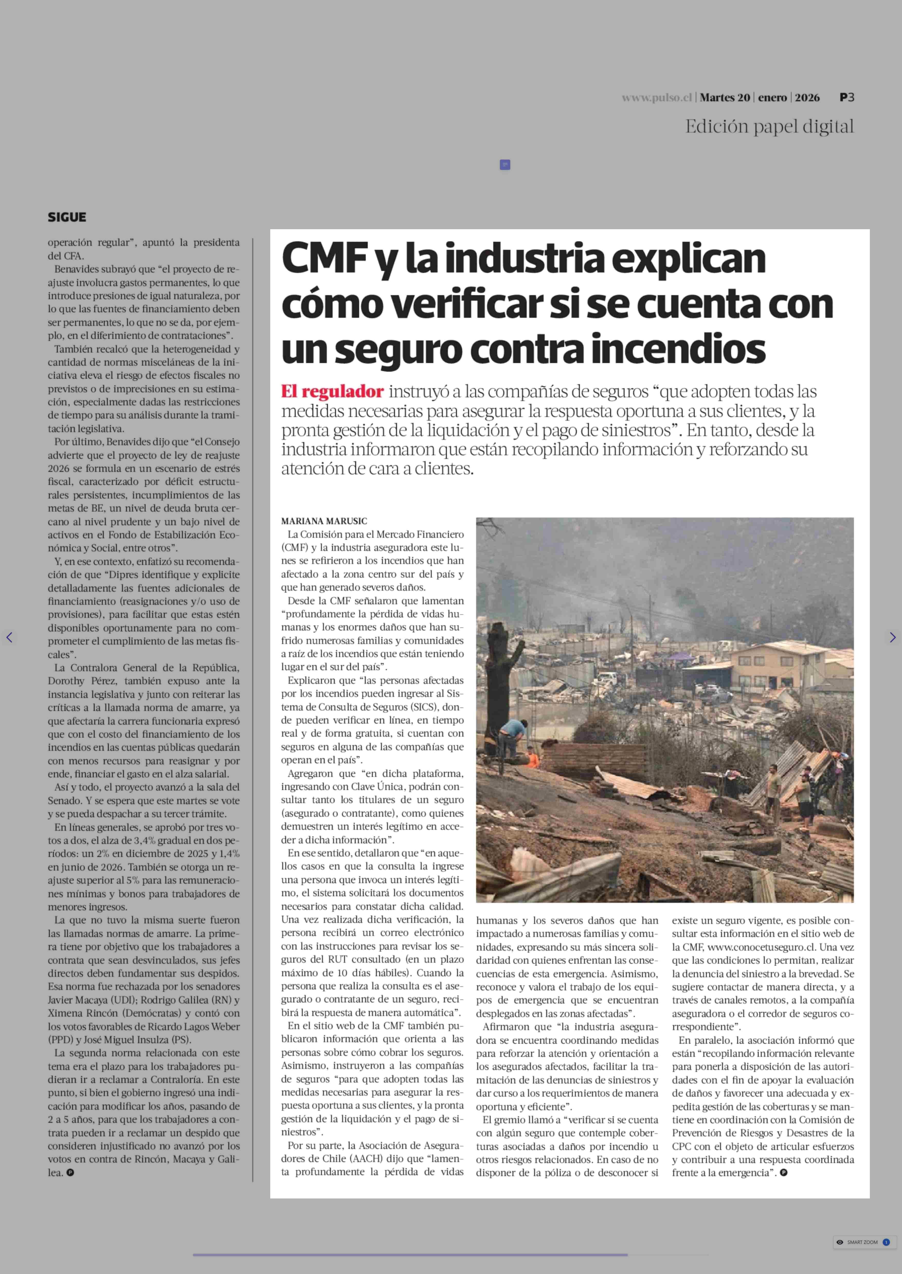 CMF y la industria explican cómo verificar si se cuenta con un seguro contra incendios 20-01-2026 La Tercera |