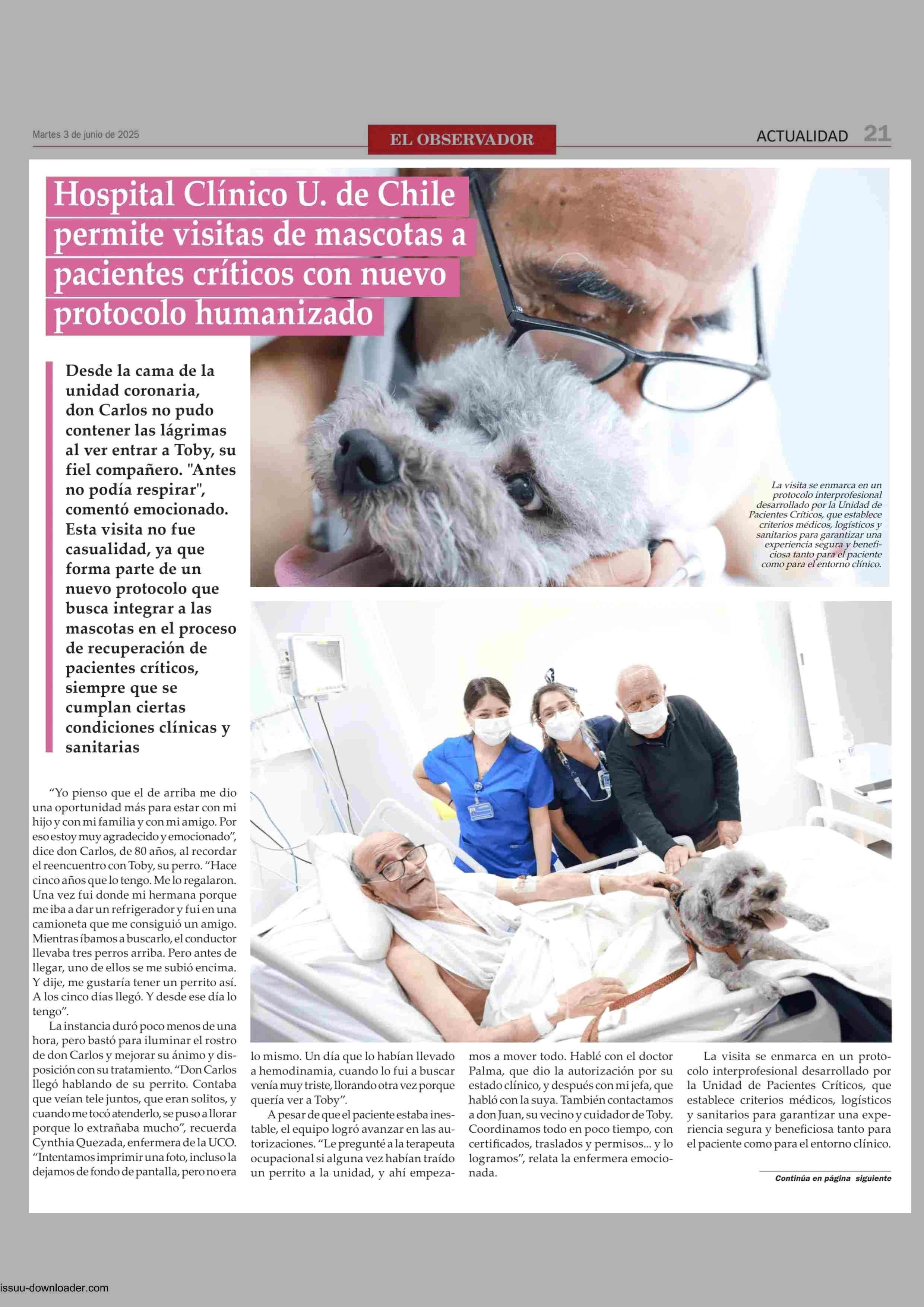 | Título: | Hospital Clínico U. de Chile permite visitas de mascotas a pacientes críticos con nuevo protocolo humanizado |