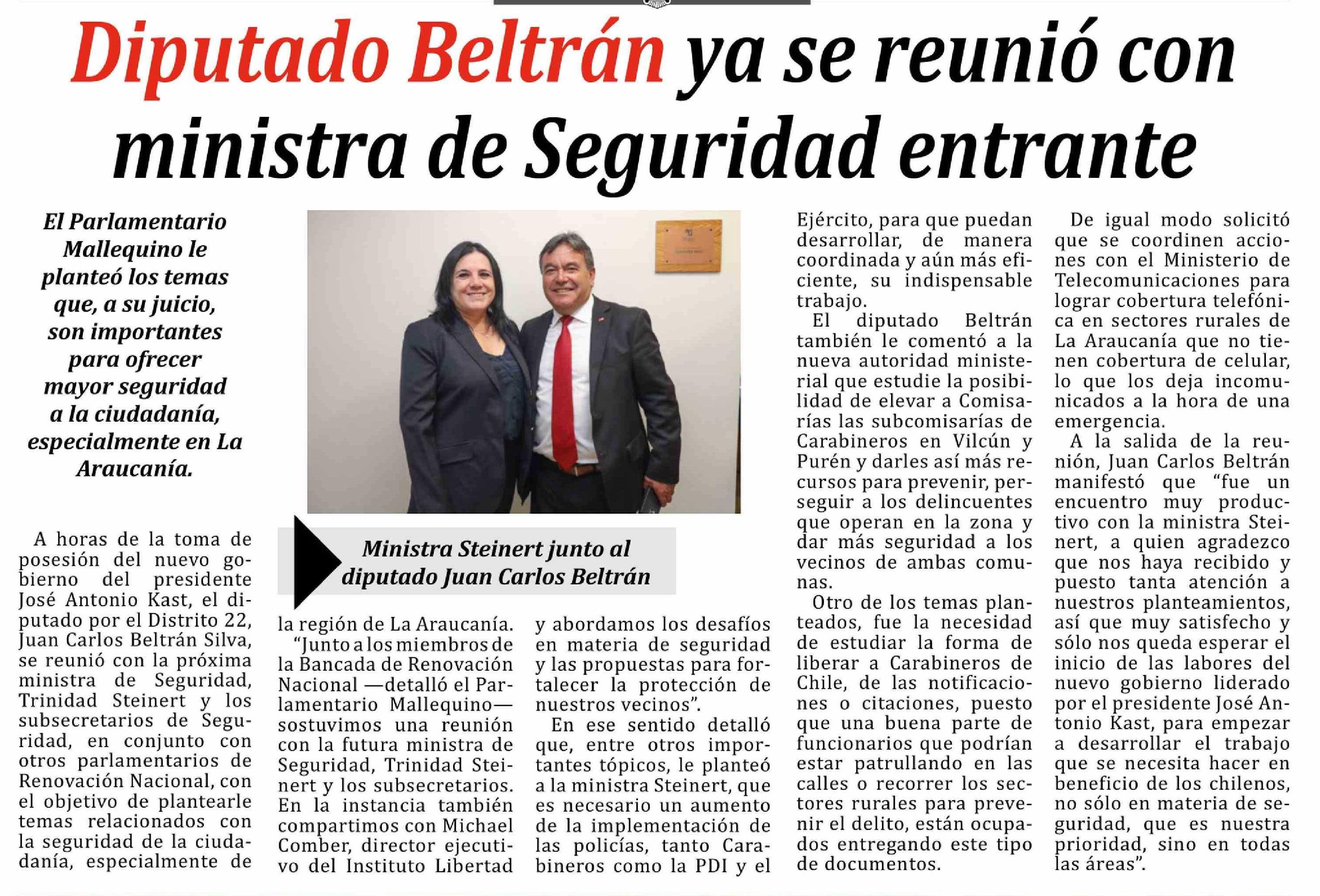 Título: Diputado Beltrán ya se reunió con ministra de Seguridad entrante