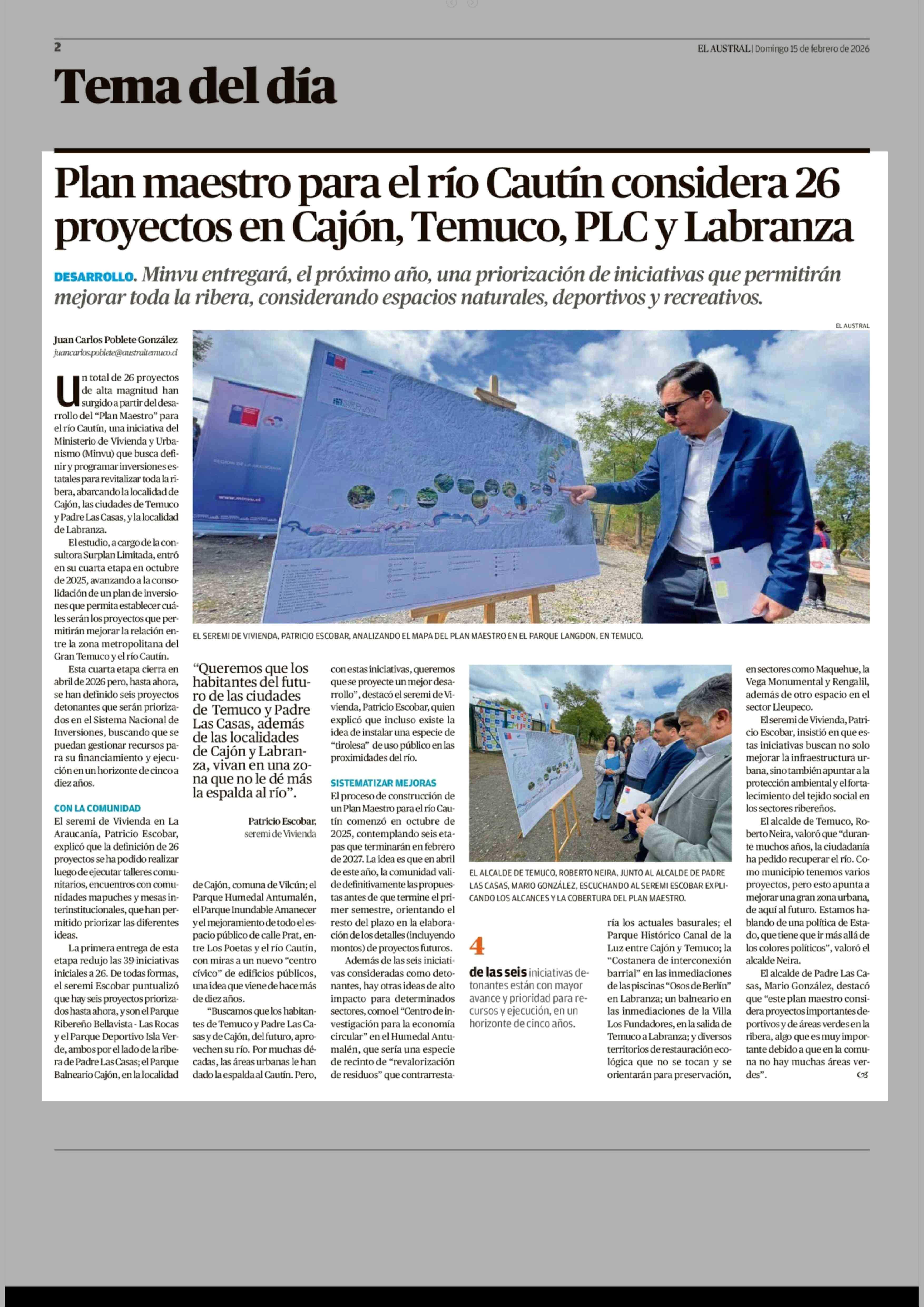 Plan maestro para el río Cautín considera 26 proyectos en Cajón, Temuco, PLC y Labranza 15-02-2026 El Austral de la Araucanía |