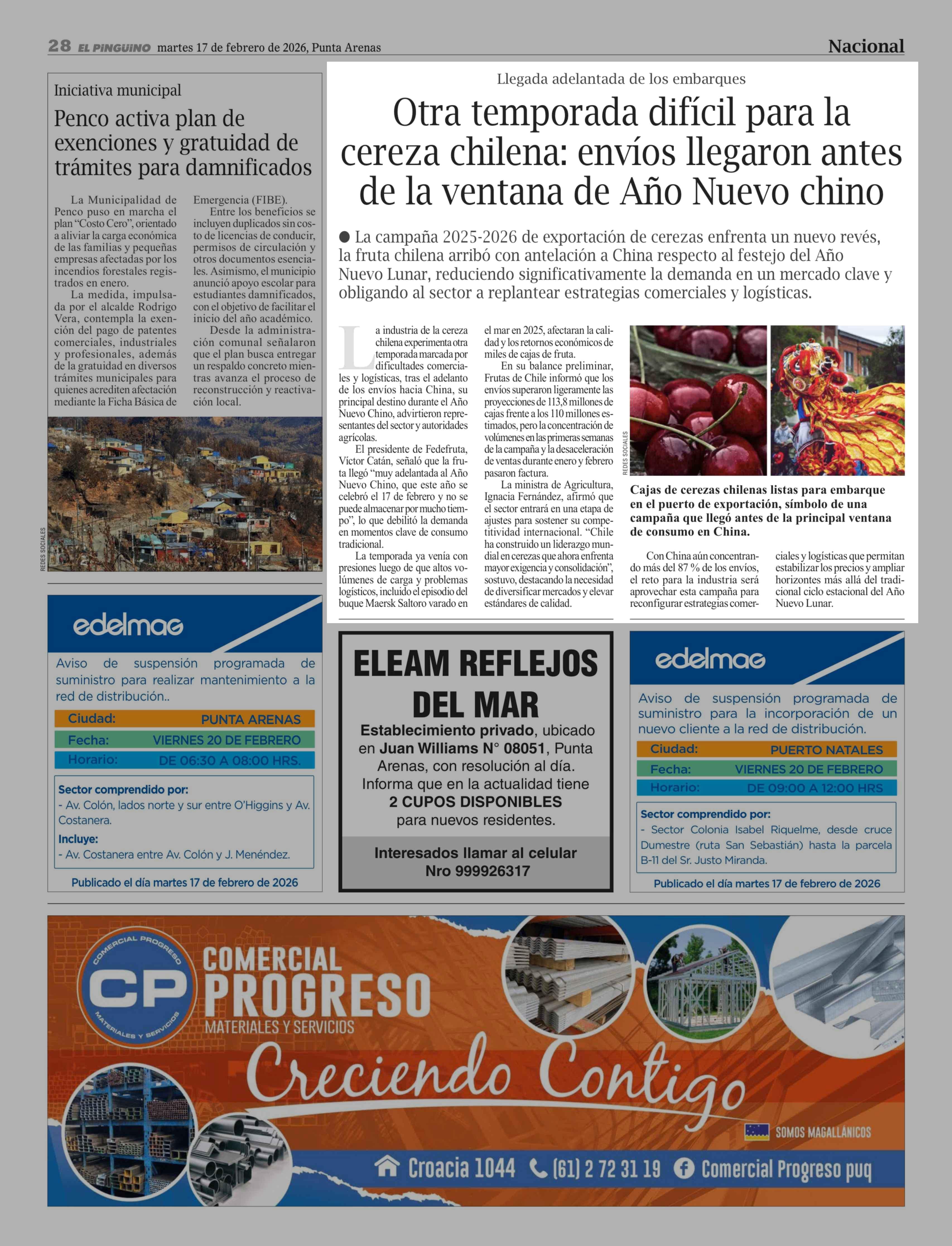 Otra temporada difícil para la cereza chilena: envíos llegaron antes de la ventana de Año Nuevo chino 17-02-2026 El Pingüino |