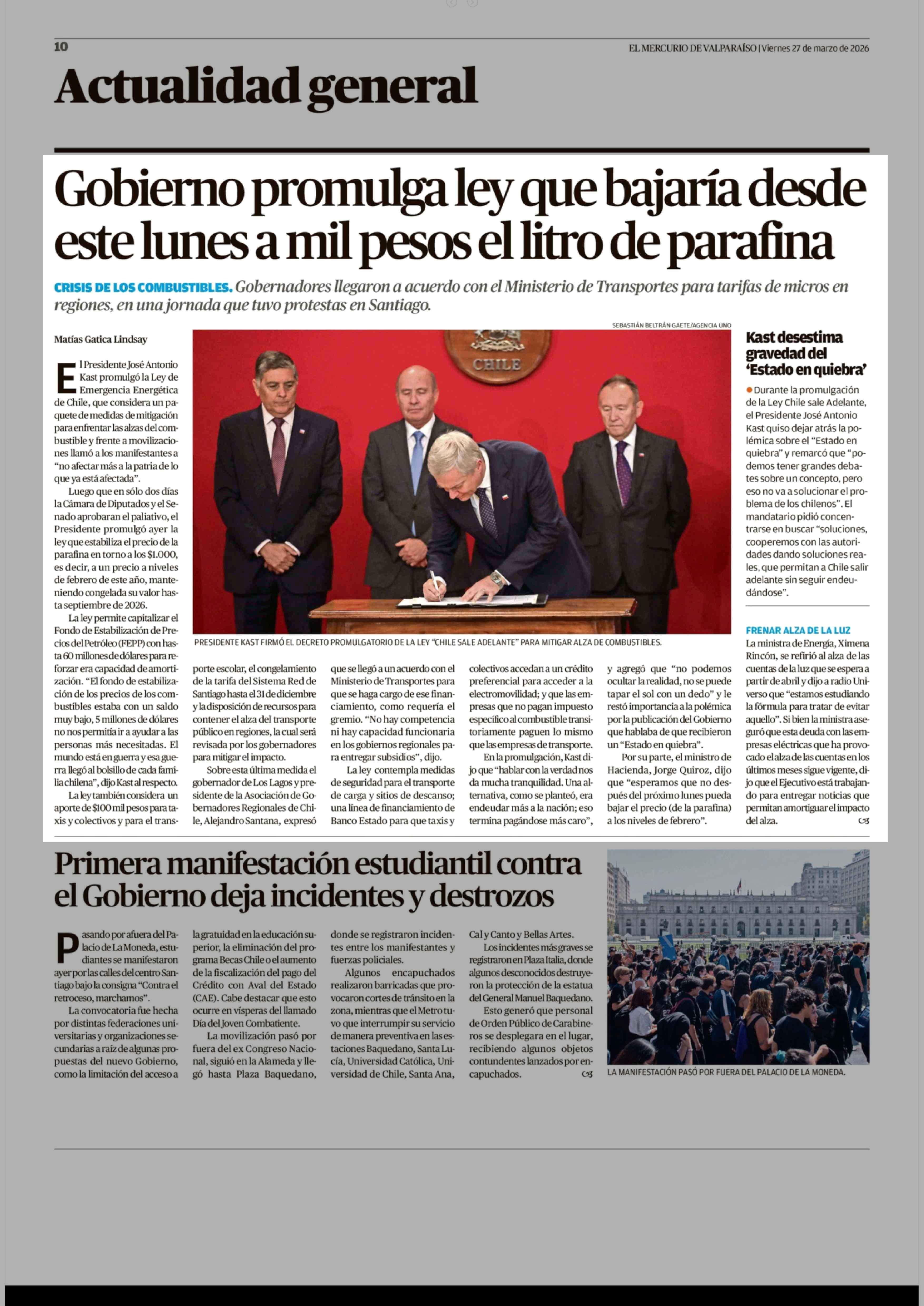 Gobierno promulga ley que bajaría desde este lunes a mil pesos el litro de parafina 27-03-2026 El Mercurio de Valparaíso |