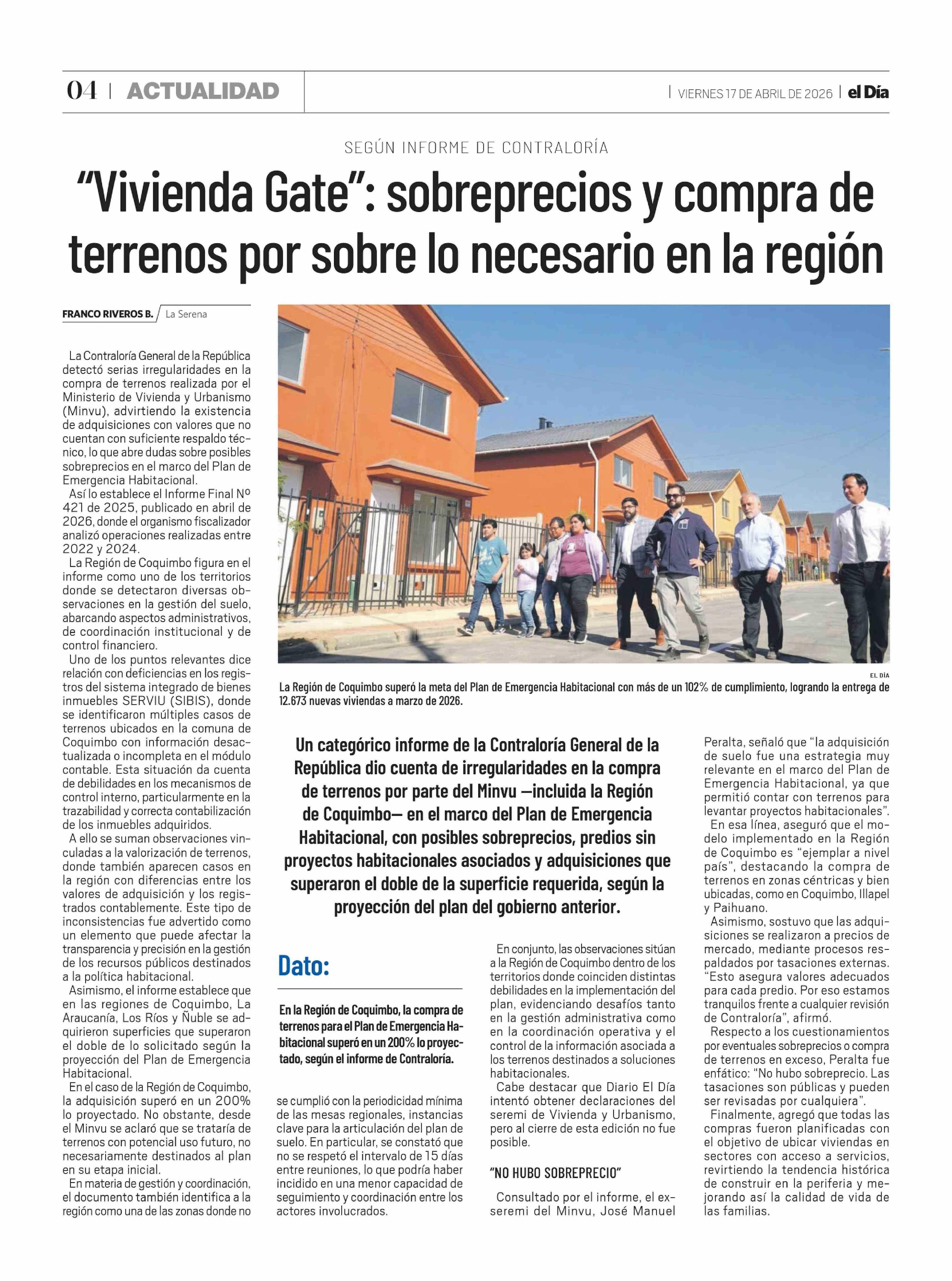 Título: "Vivienda Gate": sobreprecios y compra de terrenos por sobre lo necesario en la región