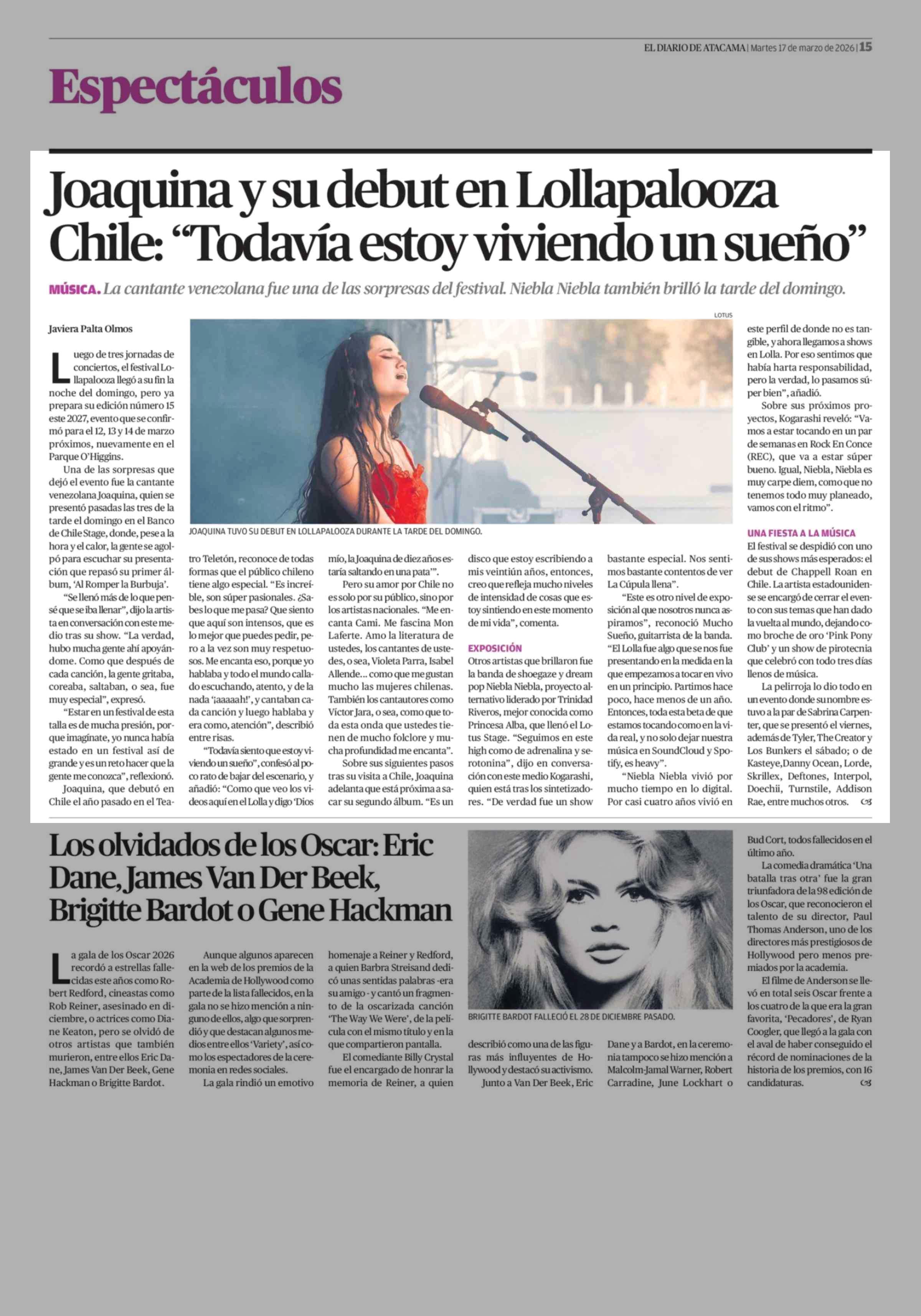 Joaquina y su debut en Lollapalooza Chile: "Todavía estoy viviendo un sueño" 17-03-2026 El Diario de Atacama |