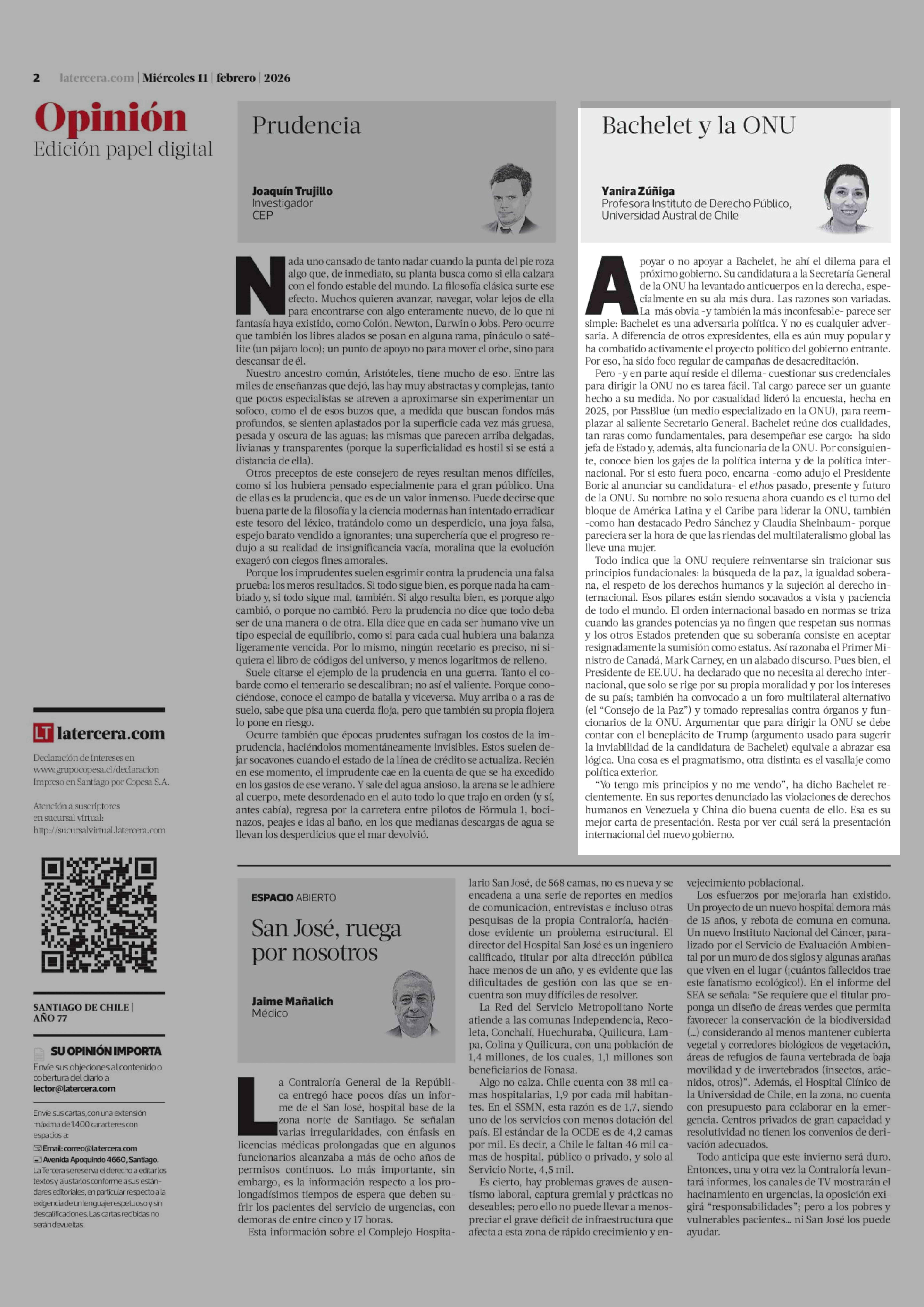 Columnas de Opinión: Bachelet y la ONU 11-02-2026 La Tercera |