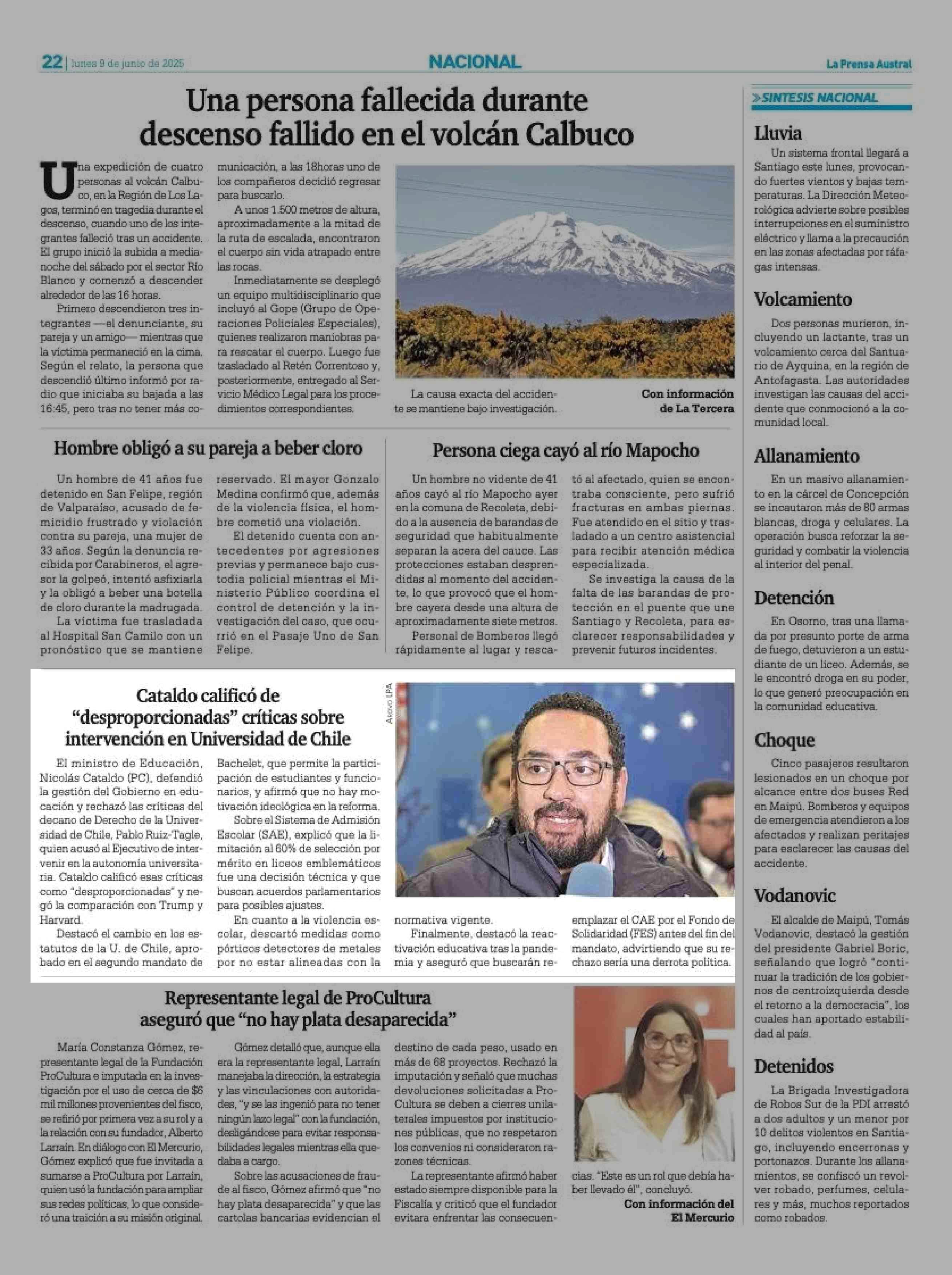 Cataldo calificó de “desproporcionadas” críticas sobre intervención en Universidad de Chile 09-06-2025 La Prensa Austral |