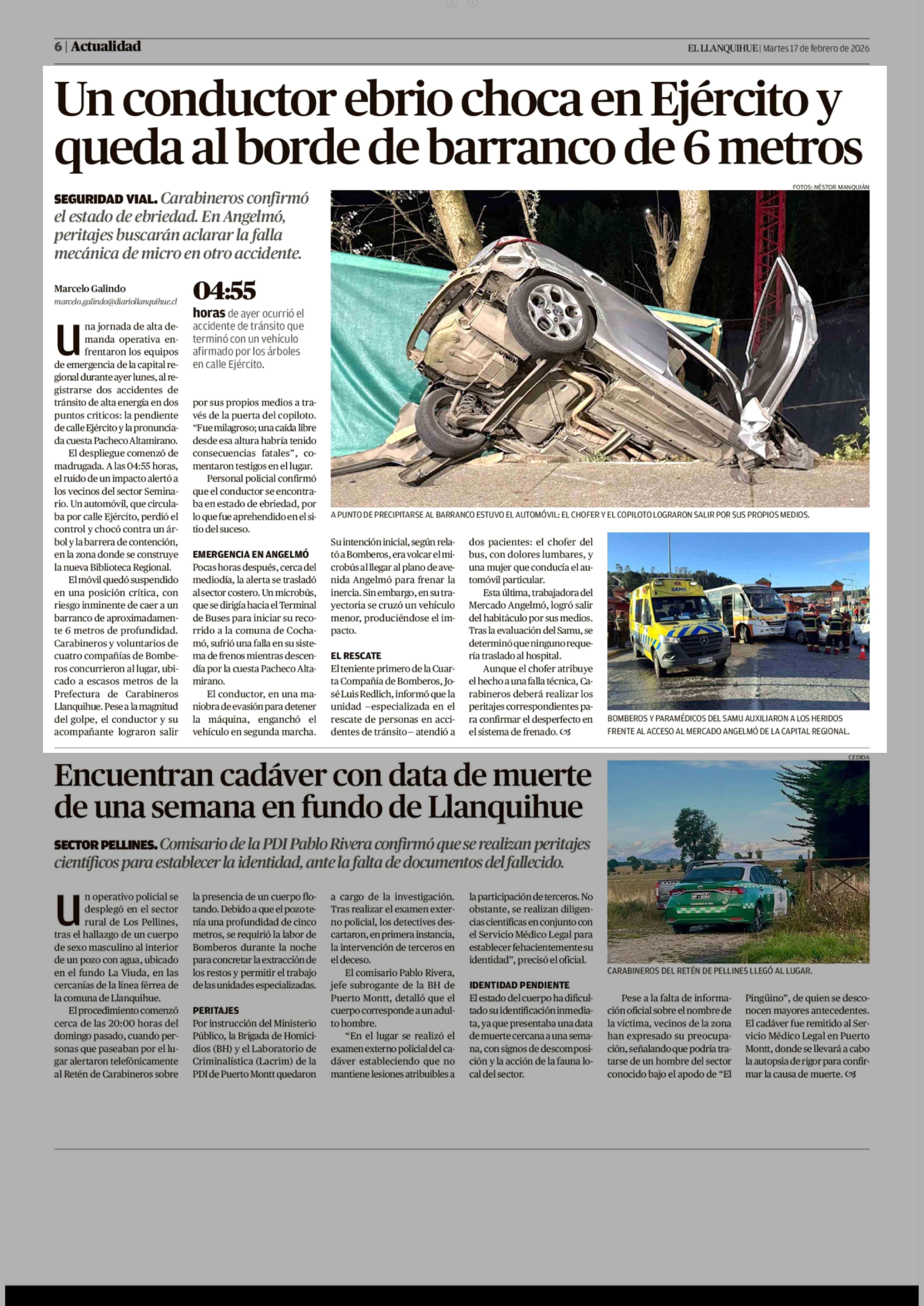 Un conductor ebrio choca en Ejército y queda al borde de barranco de 6 metros 17-02-2026 El Llanquihue |