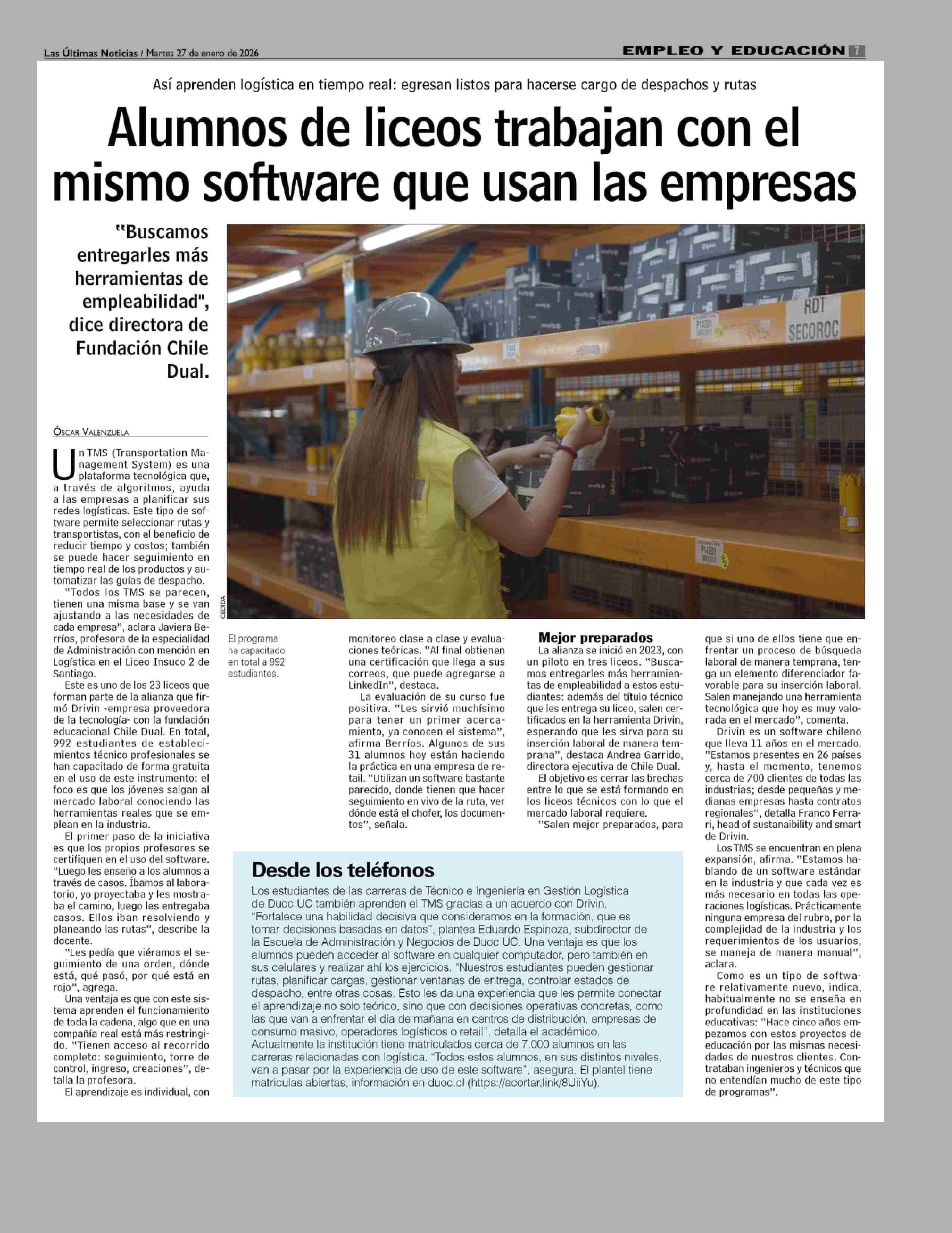 Alumnos de liceos trabajan con el mismo software que usan las empresas 27-01-2026 Las Últimas Noticias |